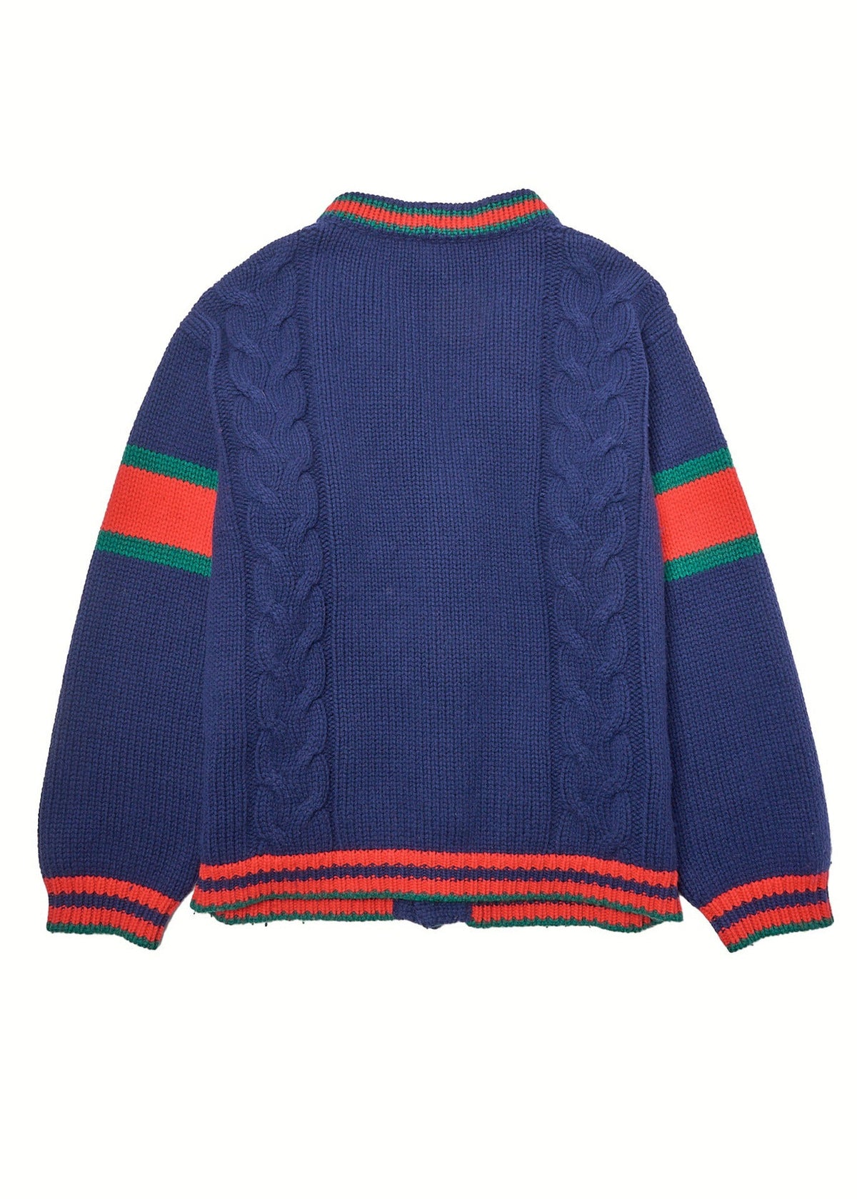 Mit ihrem atemberaubenden zweifarbigen Design in tiefem Marineblau, akzentuiert durch satte Rot- und Grüntöne, ist diese Strickjacke nicht nur ein Kleidungsstück, sondern ein Statement für Eleganz und erlesenen Geschmack. Der klassische Schnitt in Größe S sorgt für eine schmeichelhafte Silhouette für jeden Anlass.
