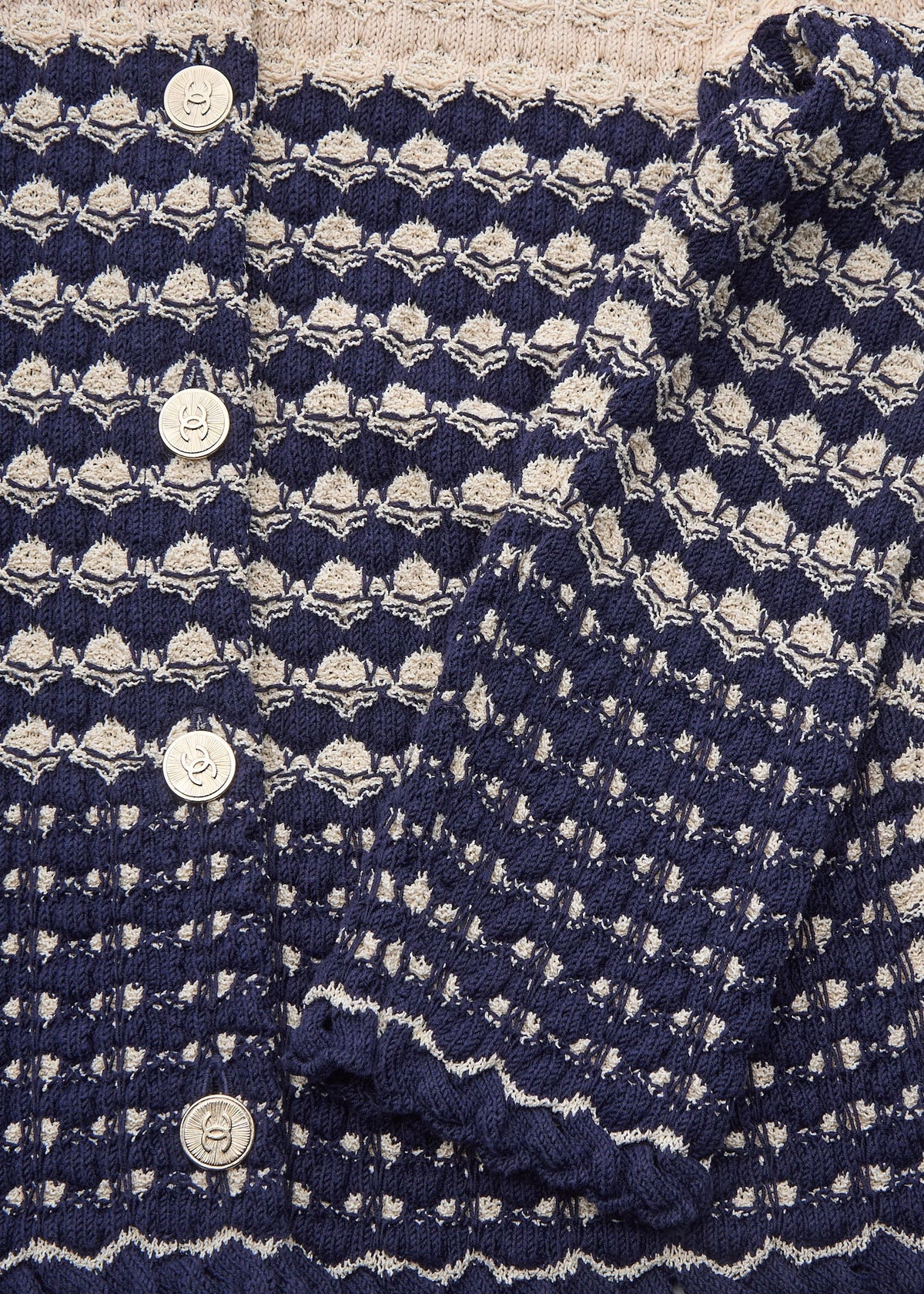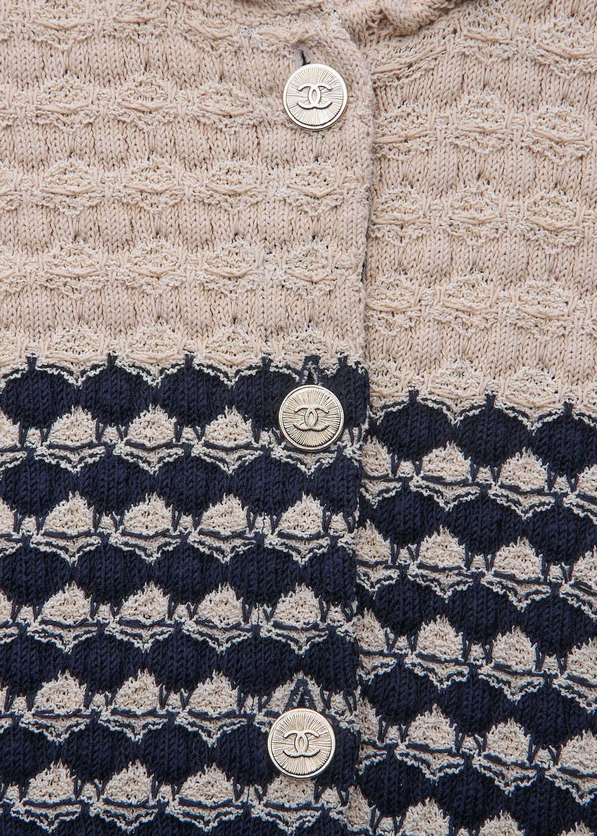 Diese Strickjacke aus einer luxuriösen Mischung aus 40 % Viskose , 30 % Baumwolle , 24 % Seide und 3 % anderen Materialien fühlt sich weich an und sitzt bequem. Die elegante Farbkombination aus Beige und Marineblau verleiht ein klassisches Flair, während das Strickdesign die Vielseitigkeit erhöht und mühelos elegante oder legere Outfits ermöglicht.