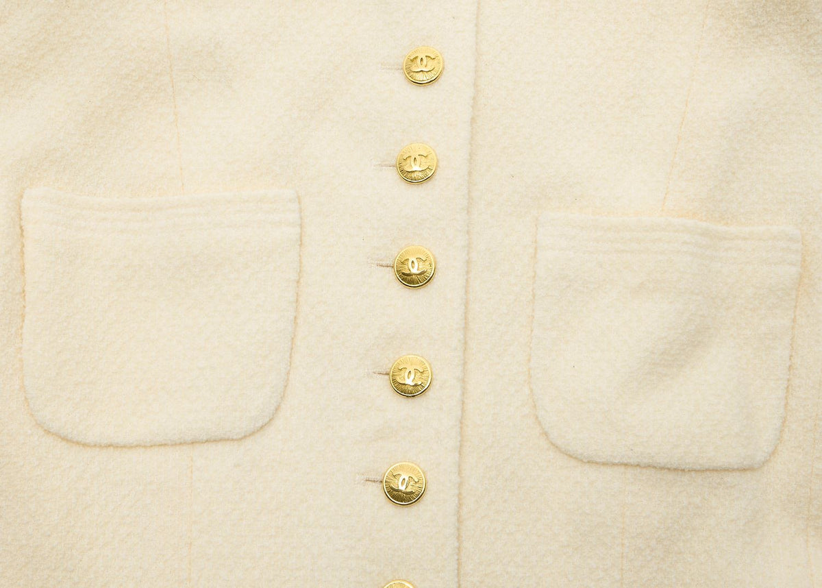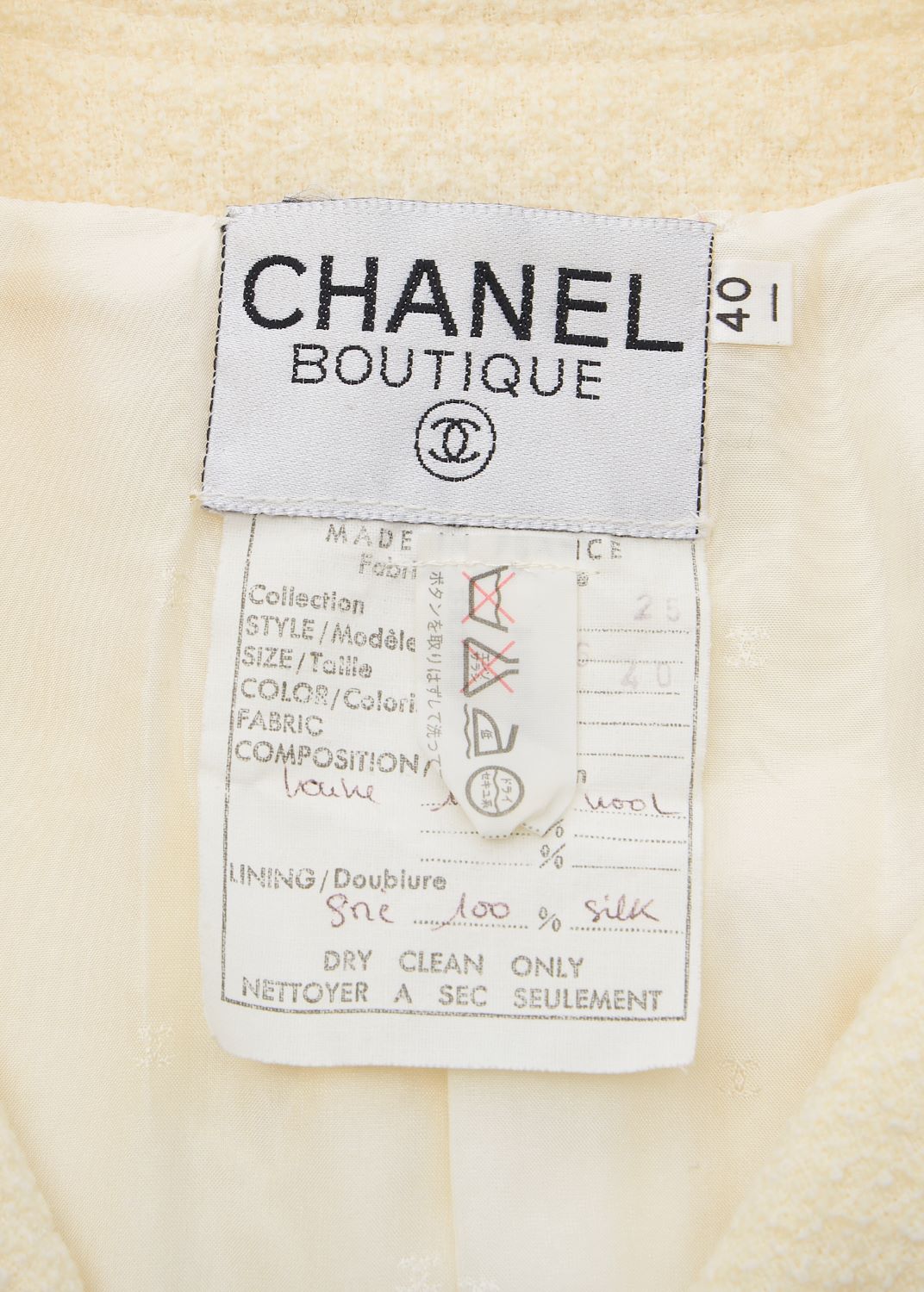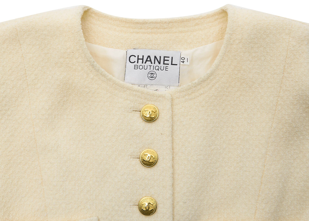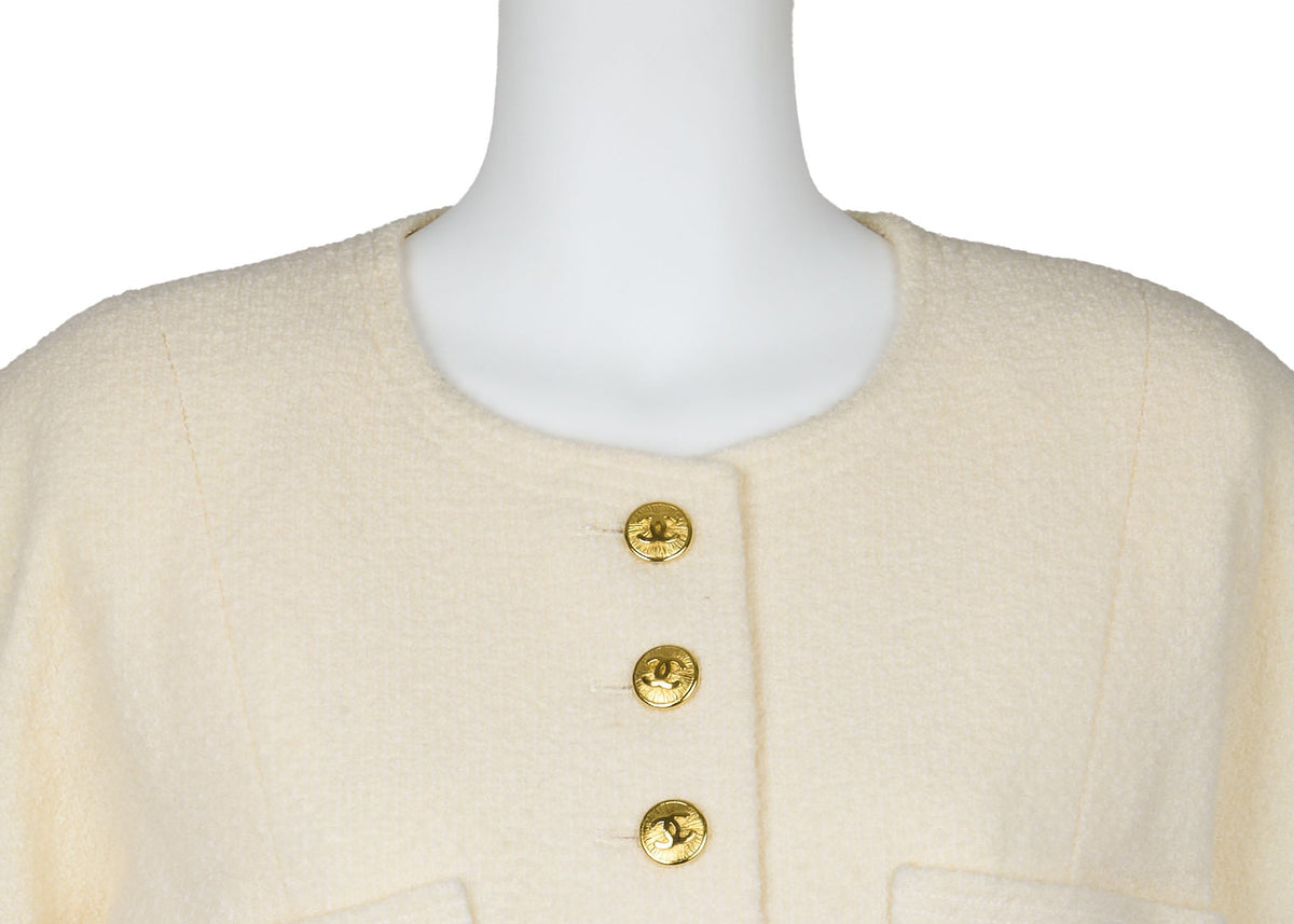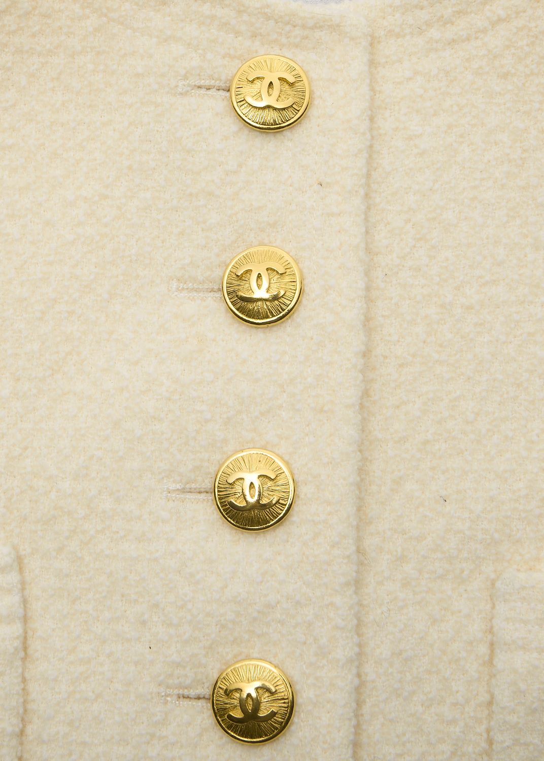 Entdecken Sie die Eleganz der CHANEL Coco Button Collarless Jacke 40 , ein atemberaubendes Oberbekleidungsstück, das Eleganz und Komfort perfekt vereint. Diese elfenbeinfarbene Jacke aus 100 % hochwertiger Wolle wertet Ihre Garderobe auf und ist die perfekte Wahl für legere Anlässe und formelle Anlässe.
