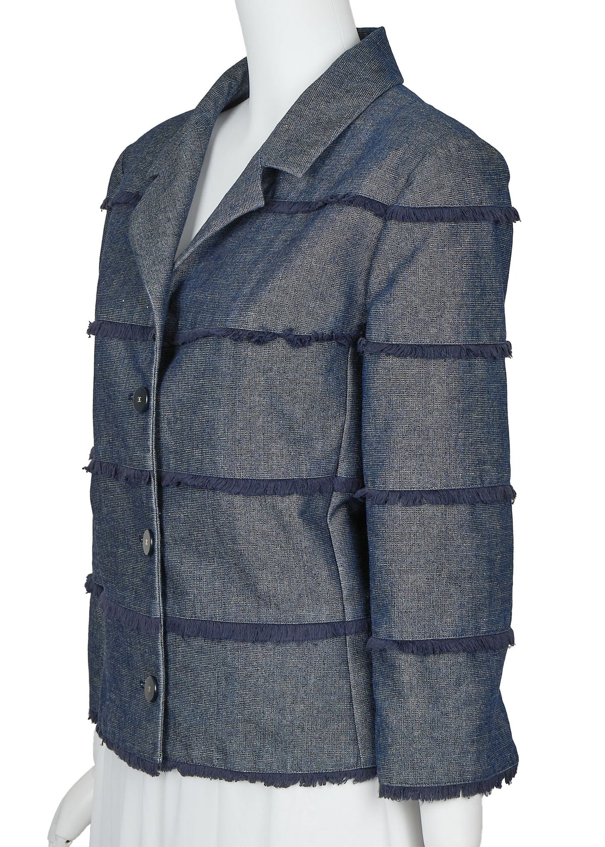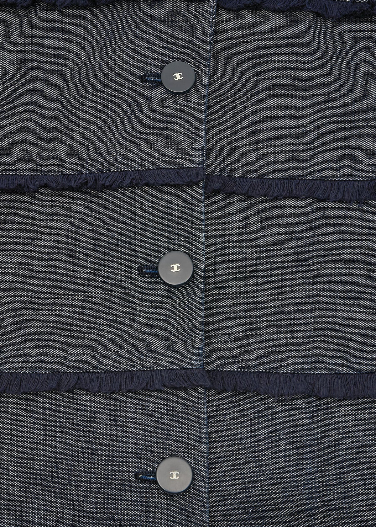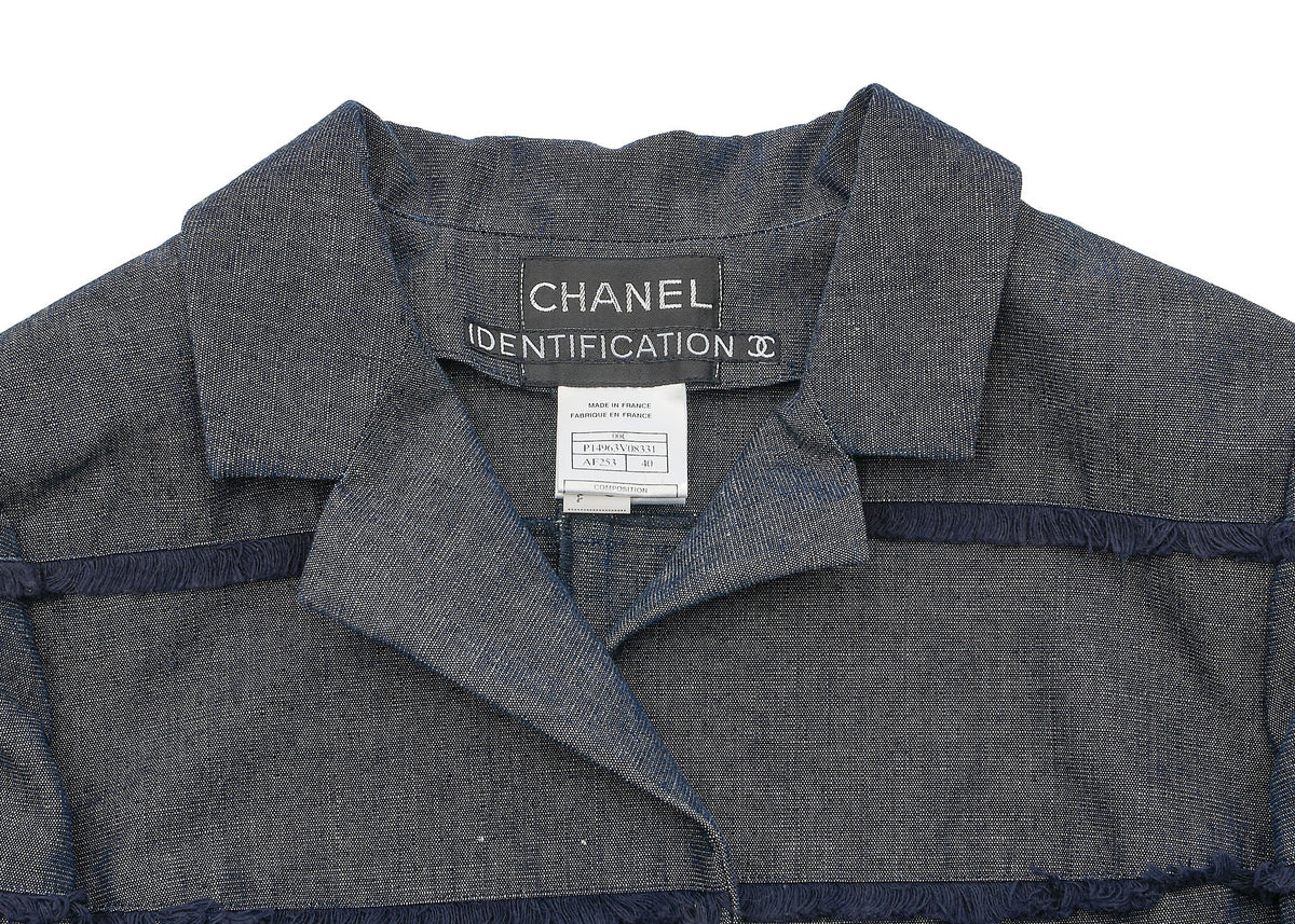 Verpassen Sie nicht dieses ikonische CHANEL -Stück, das Luxus mit Alltagstauglichkeit verbindet. Erleben Sie noch heute die Eleganz und Vielseitigkeit der CHANEL Coco Button Fringe Jeansjacke – Ihre Garderobe wird es Ihnen danken!