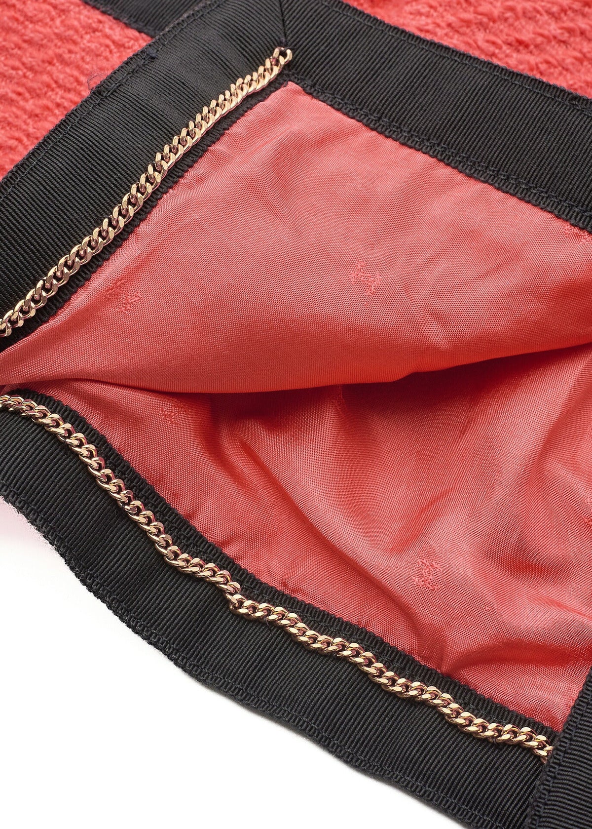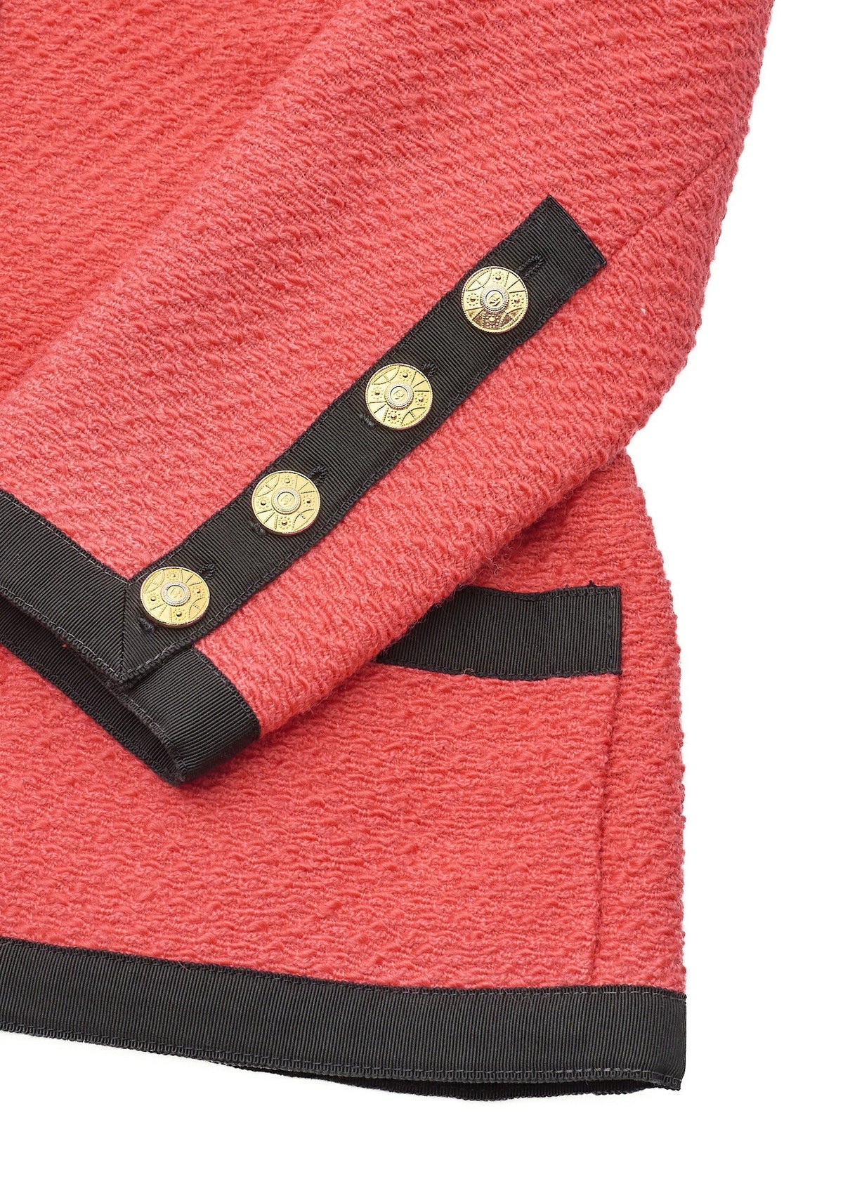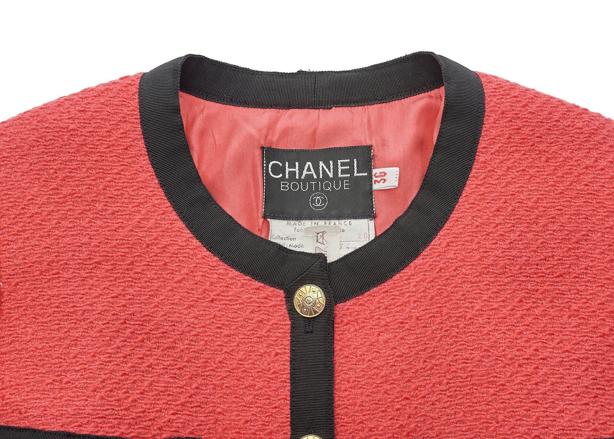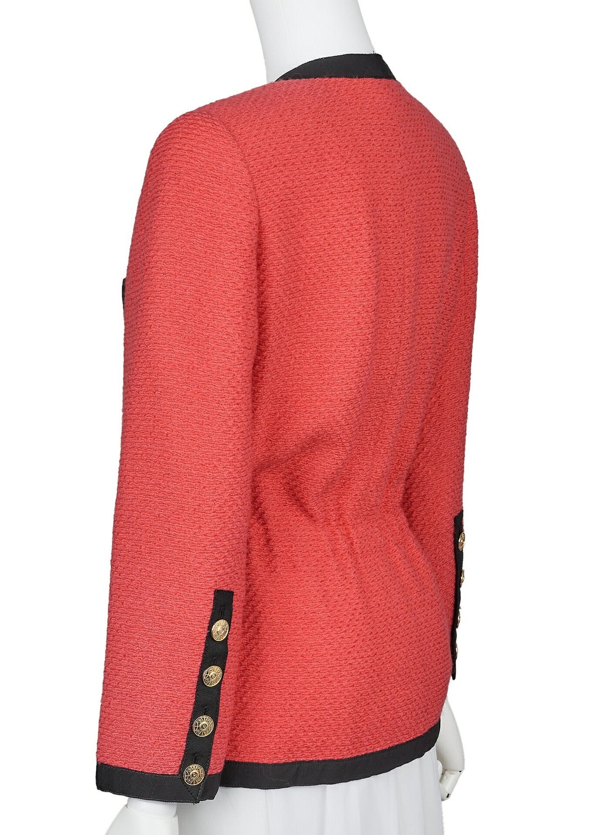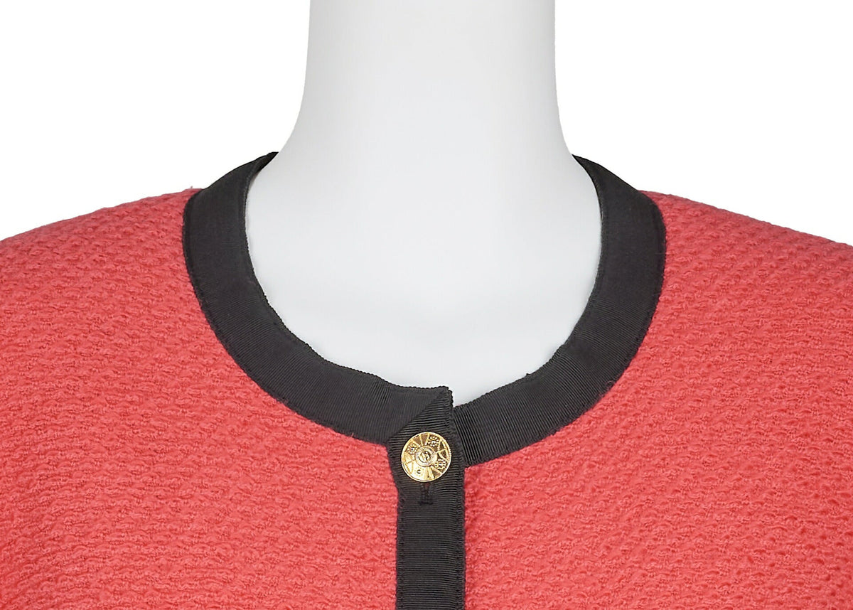 Wir präsentieren den CHANEL Coco Button Outerwear Coat ohne Kragen , eine luxuriöse Mischung aus Eleganz und Stil, die jede modebewusste Frau in ihrer Garderobe braucht. Dieses atemberaubende Langarmshirt, erhältlich in Größe 36, besticht durch sein raffiniertes Rot-Schwarz- Farbschema, das jedes Outfit mühelos aufwertet.