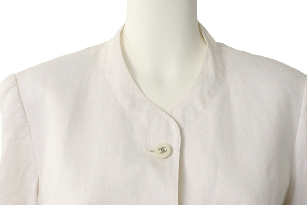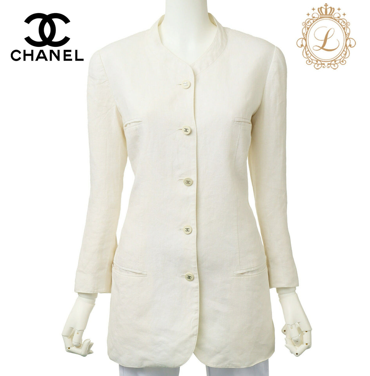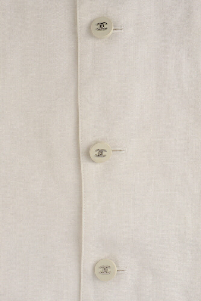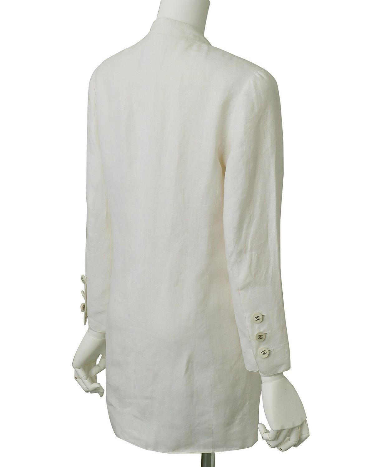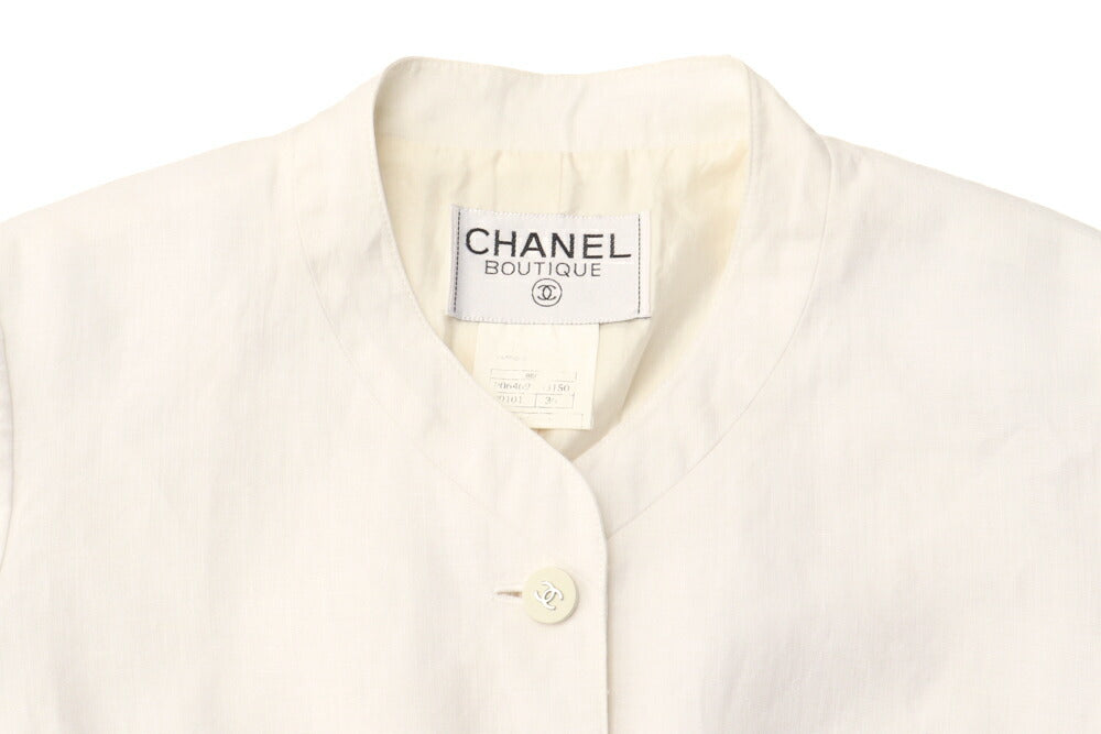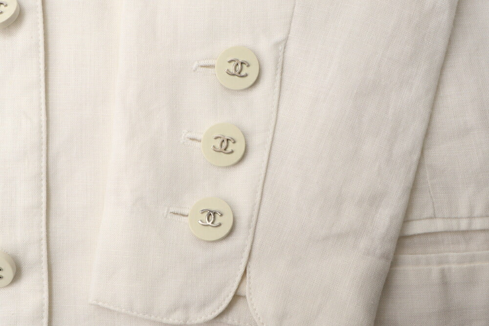 Werten Sie Ihre Garderobe mit der CHANEL Coco Button No Collar Jacke auf, einem atemberaubenden Stück, das klassische Eleganz mit moderner Raffinesse verbindet. Gefertigt aus 100 % hochwertigem Leinen ist diese Jacke nicht nur leicht, sondern auch atmungsaktiv und somit die perfekte Wahl für jede Jahreszeit.