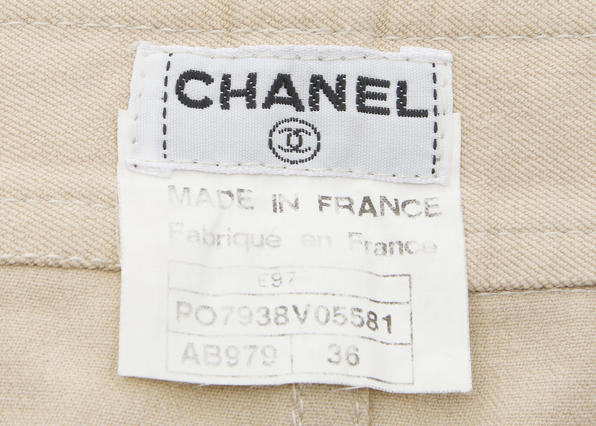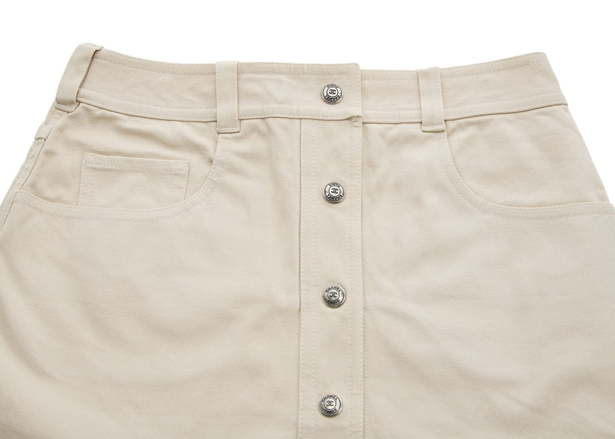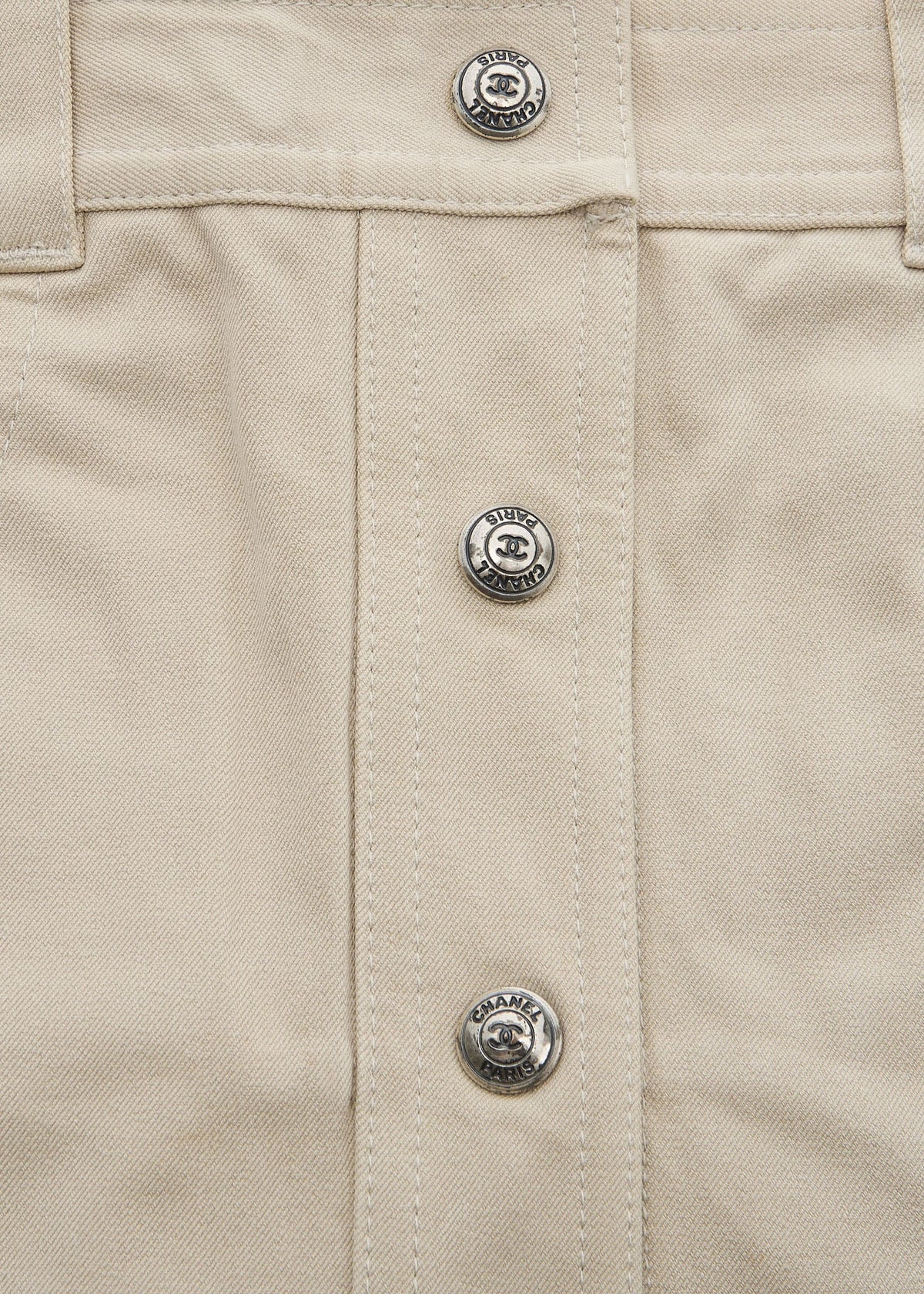 Werten Sie Ihre Garderobe mit dem CHANEL Coco Button Skirt 36 auf, einem atemberaubenden beigefarbenen Minirock, der die zeitlose Eleganz von CHANEL unterstreicht. Gefertigt aus einer hochwertigen Baumwollmischung aus 96 % Baumwolle bietet dieser Rock Komfort und Strapazierfähigkeit und ist somit ein unverzichtbares Accessoire für Ihre Modekollektion.