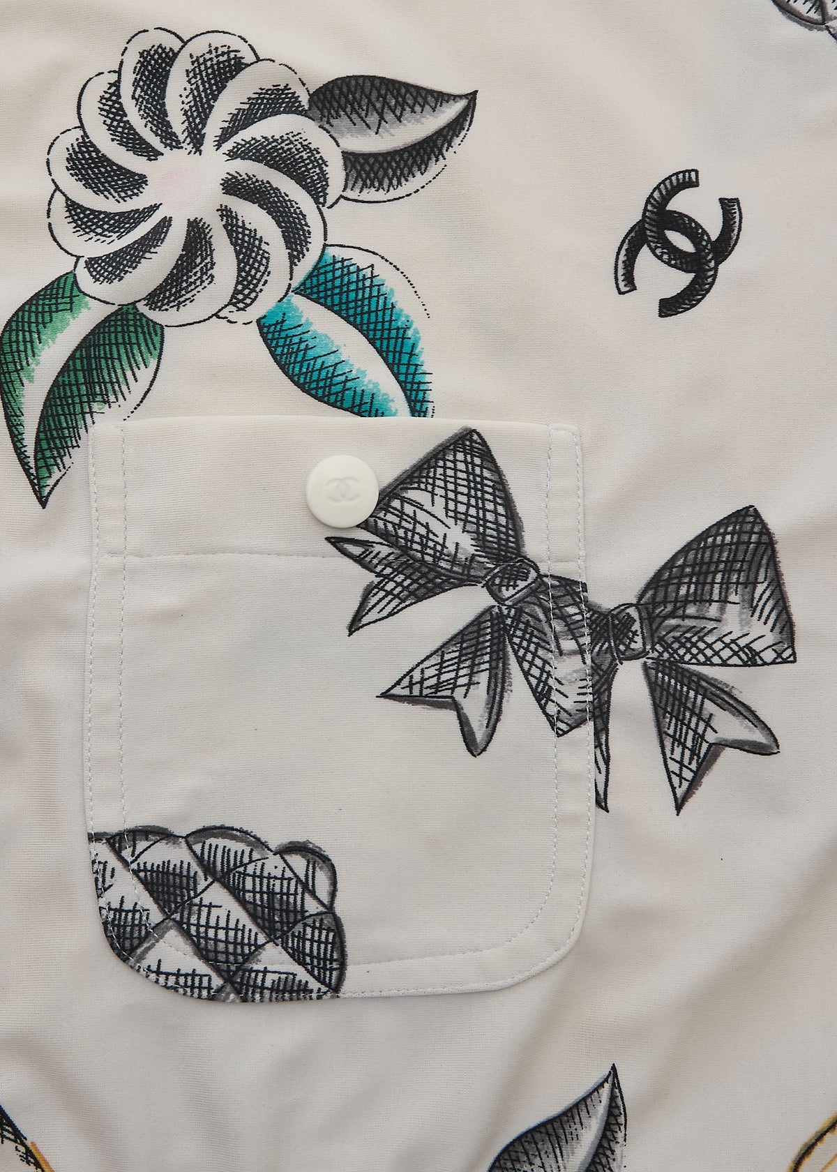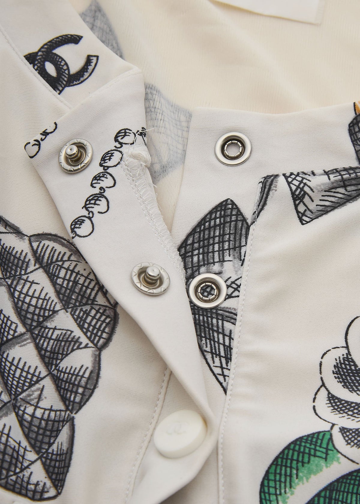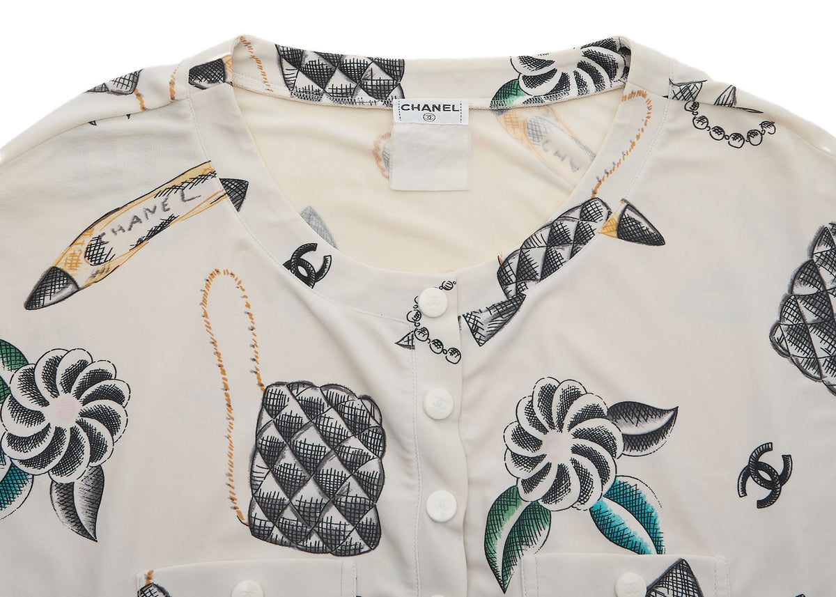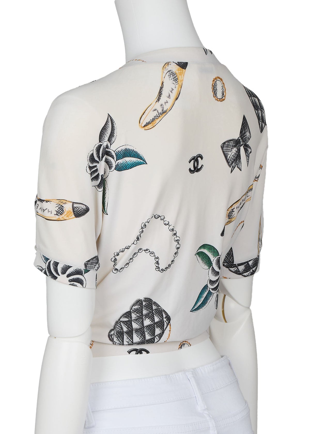 Die klassische weiße Farbe bietet einen vielseitigen Hintergrund für jedes Outfit, während das markante Coco Mark Ribbon und das Coco Button Total Pattern einen Hauch von Eleganz und Raffinesse verleihen. Mit seinen schicken kurzen Ärmeln und der modernen, verkürzten Länge eignet sich dieses Oberteil perfekt zum Tragen im Lagenlook oder solo.