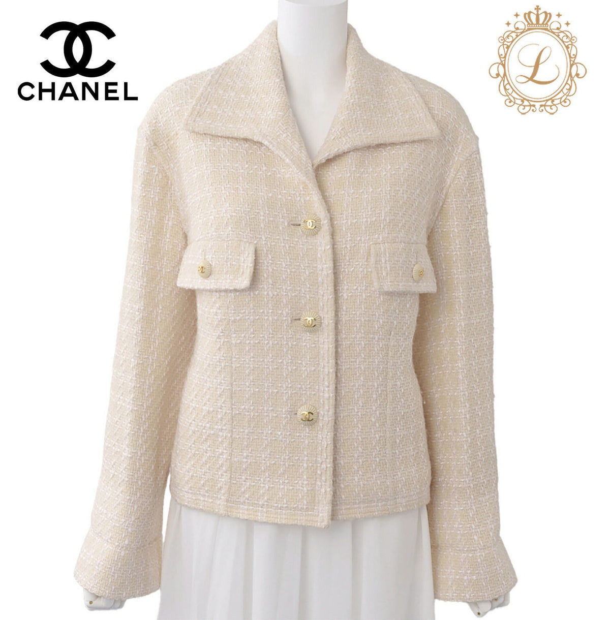 Gebrauchter Jackenmantel, Coco-Knopf, Tweed, Beige, goldfarbene Hardware, gebraucht