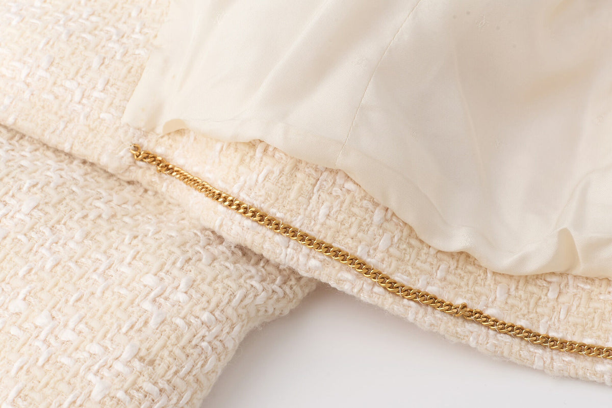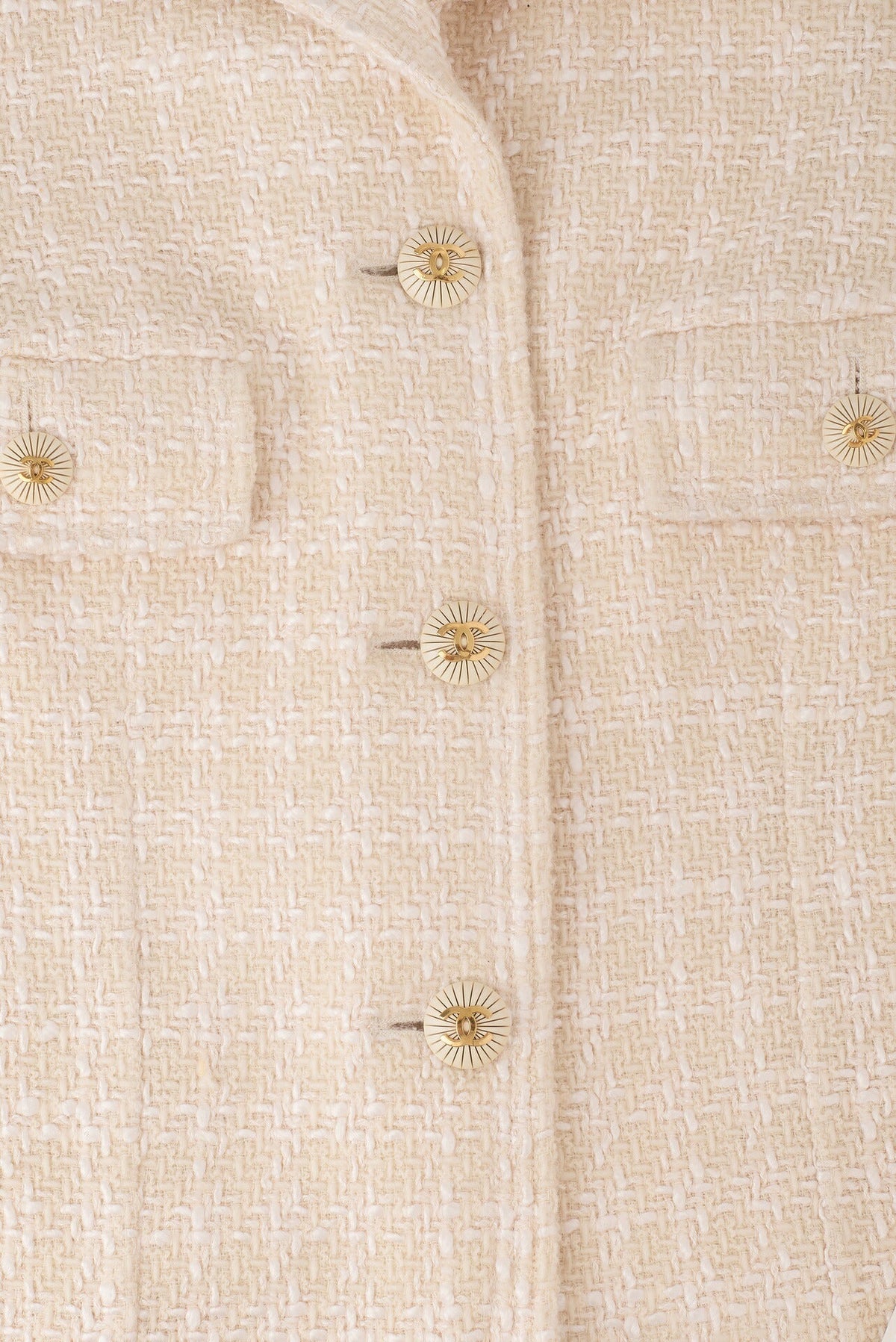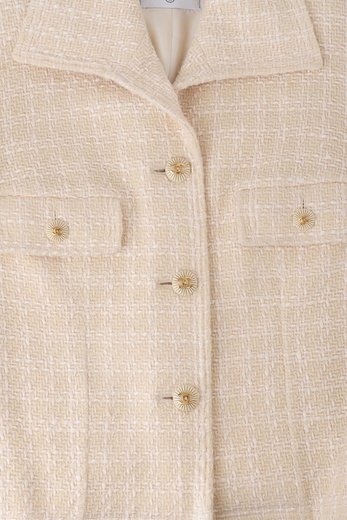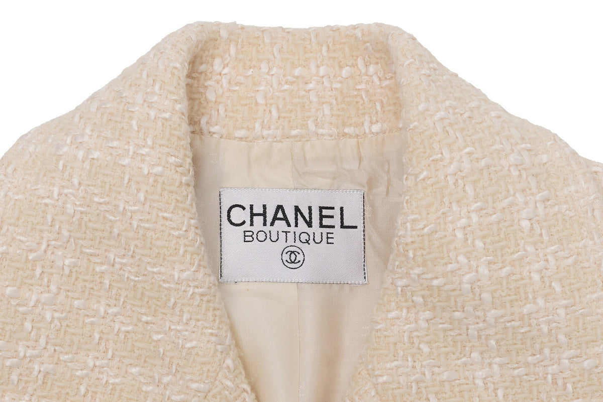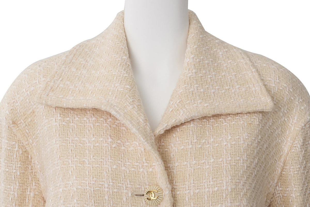Werten Sie Ihre Oberbekleidungskollektion mit der exquisiten CHANEL Coco Button Tweedjacke auf. Dieser atemberaubende Mantel, elegant gestaltet in einer raffinierten Farbpalette aus Beige und Weiß, verkörpert die zeitlose Eleganz, für die die Marke CHANEL steht.