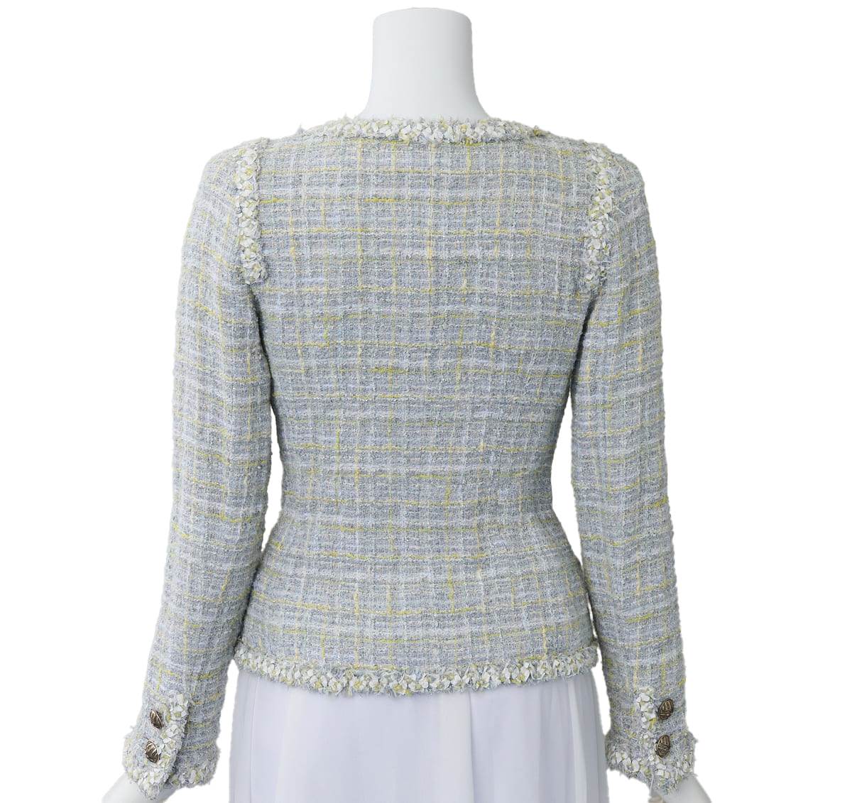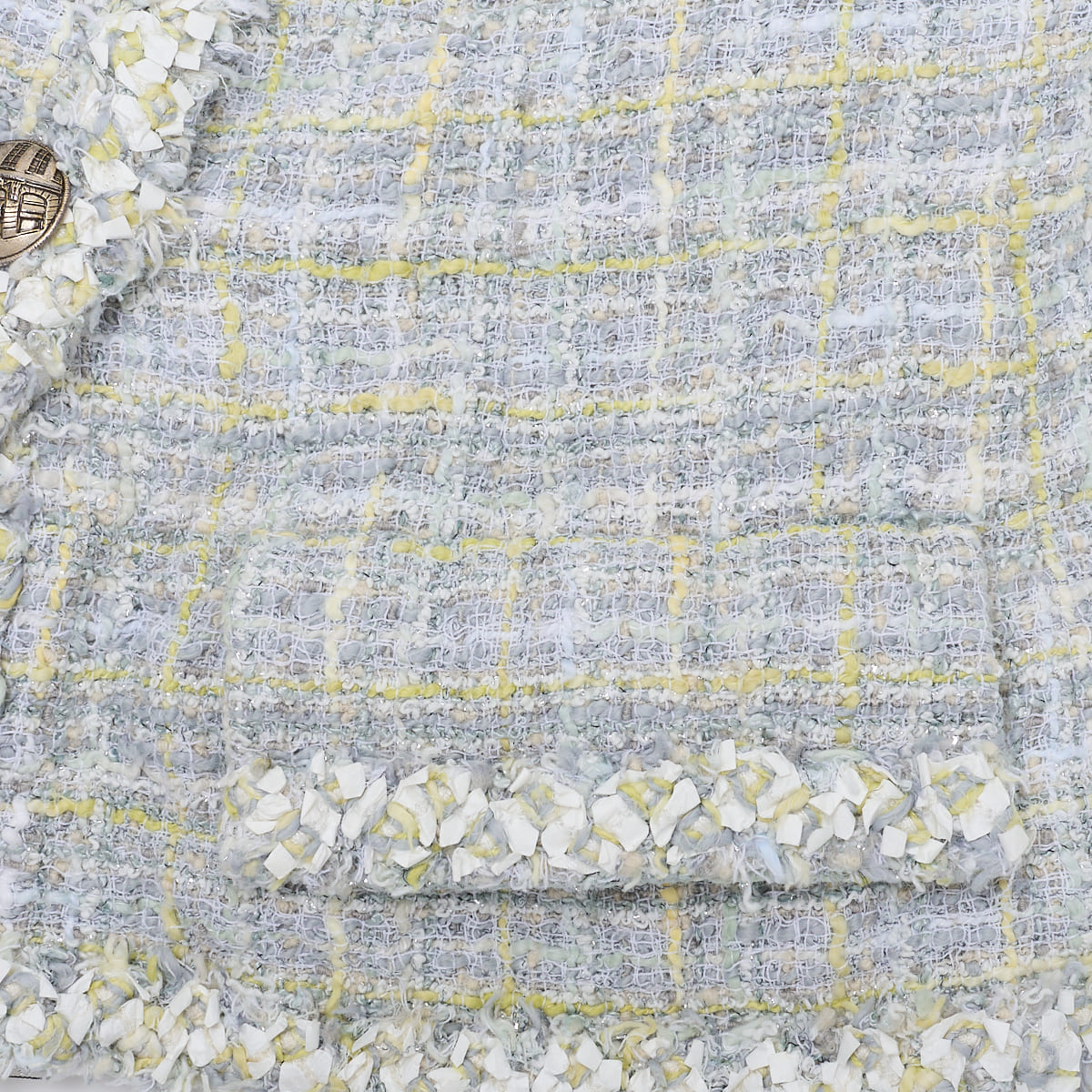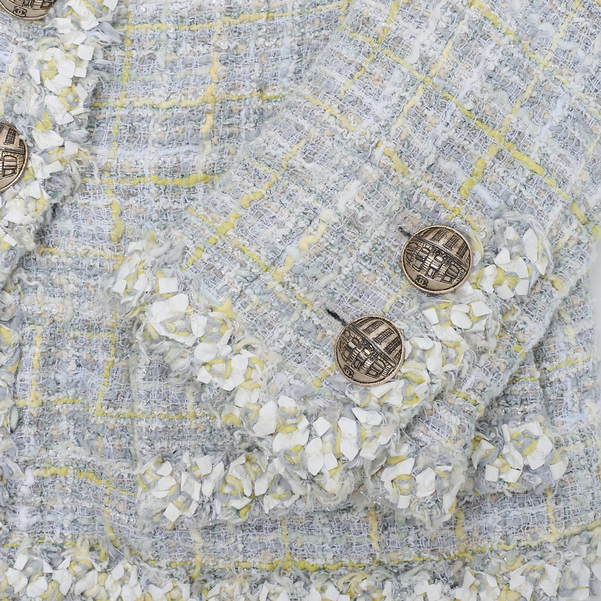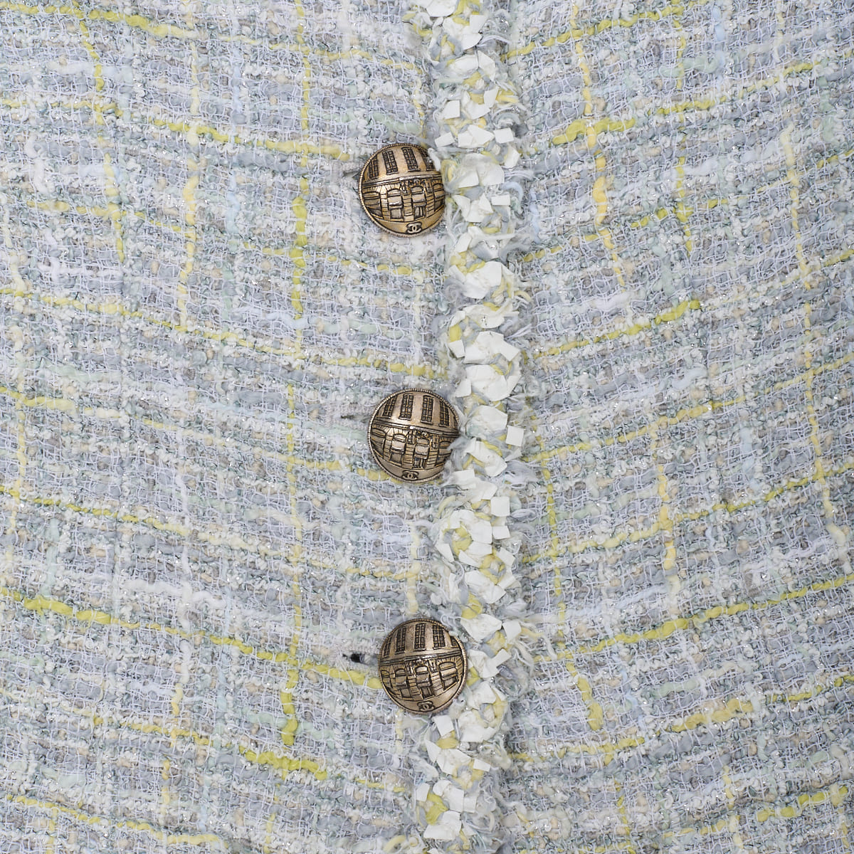 Werten Sie Ihre Garderobe mit der CHANEL Coco Button Tweed-Jacke ohne Kragen auf , einem atemberaubenden Kleidungsstück, das Eleganz und Stil perfekt vereint. Diese exquisite Jacke in einer faszinierenden Farbpalette aus Blau, Grün und Weiß ist perfekt für alle, die Luxusmode schätzen.