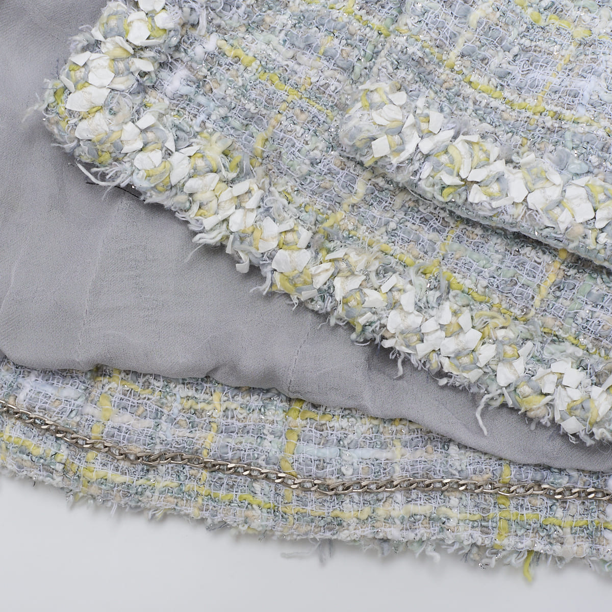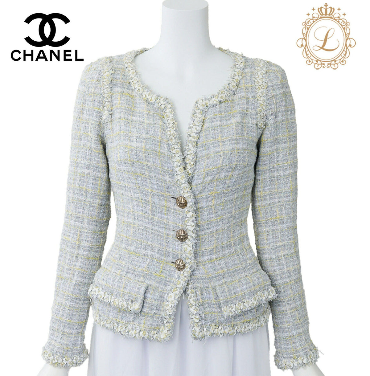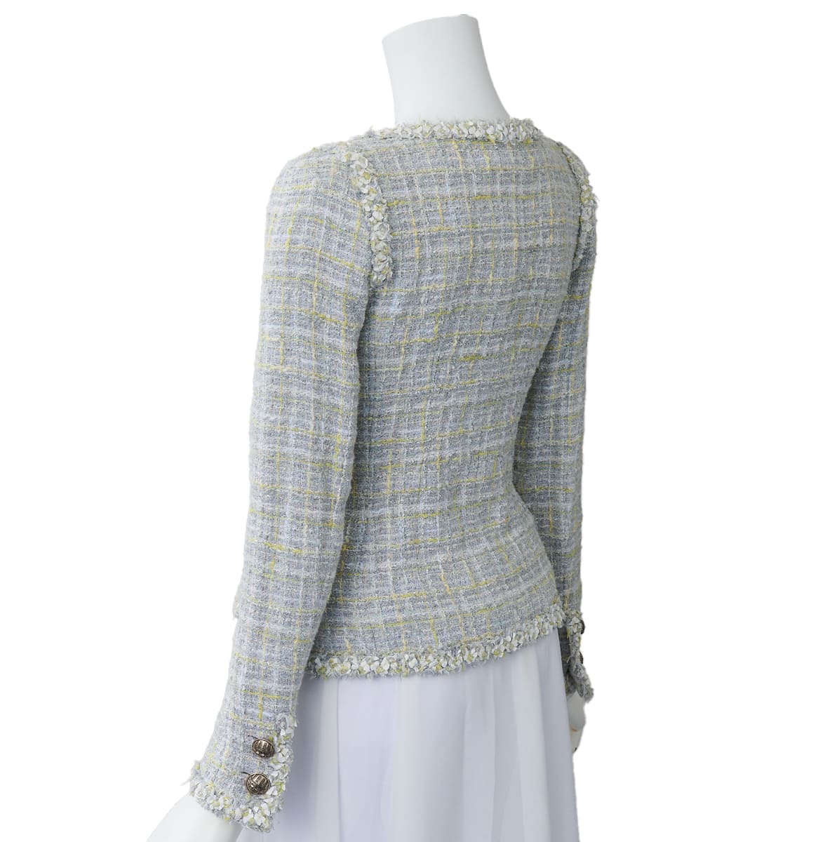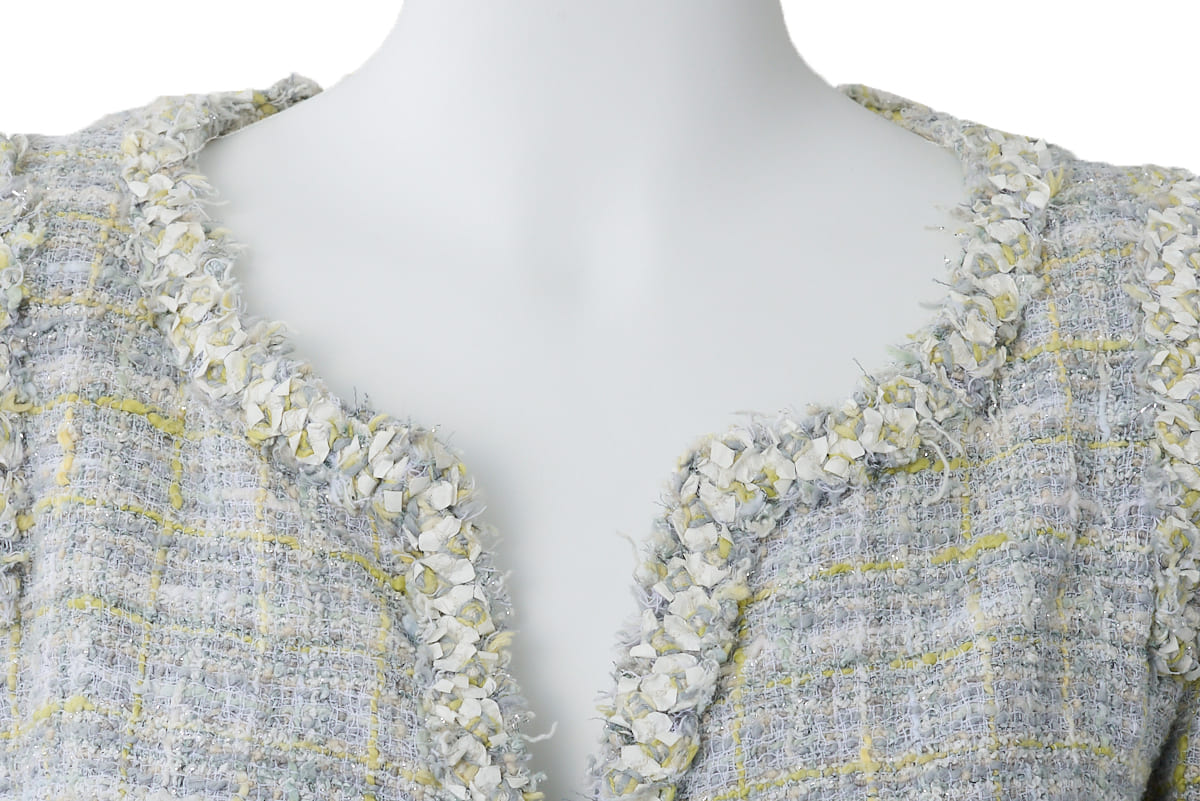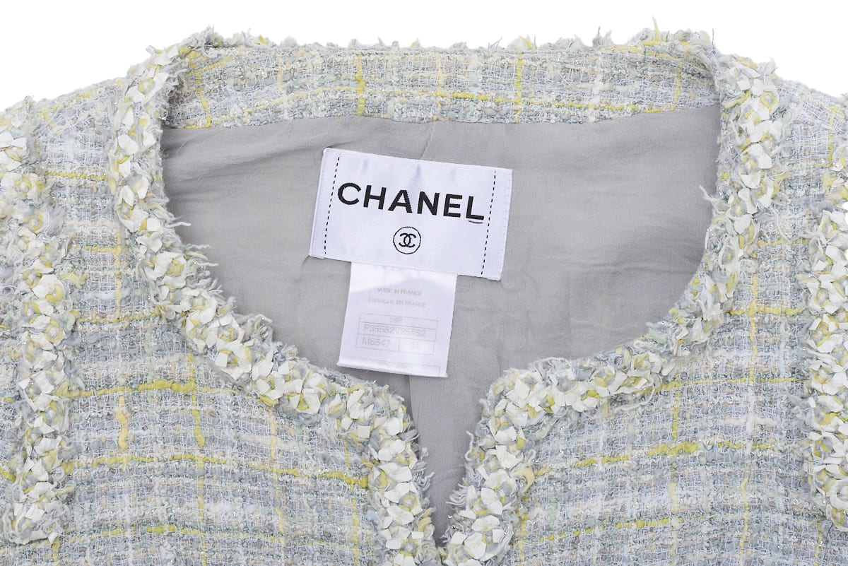 Werten Sie Ihre Garderobe mit der CHANEL Coco Button Tweed-Jacke ohne Kragen auf , einem atemberaubenden Kleidungsstück, das Eleganz und Stil perfekt vereint. Diese exquisite Jacke in einer faszinierenden Farbpalette aus Blau, Grün und Weiß ist perfekt für alle, die Luxusmode schätzen.