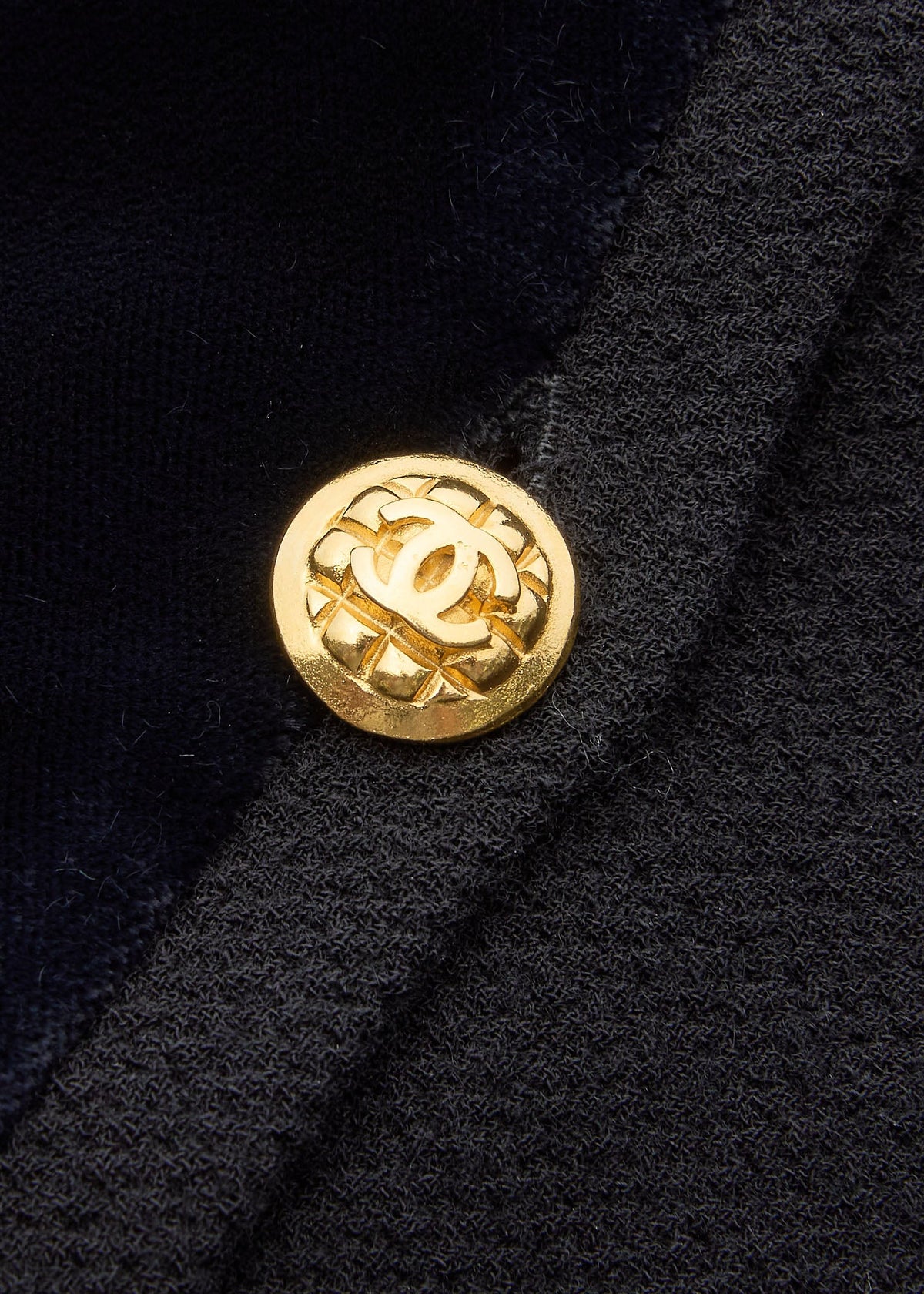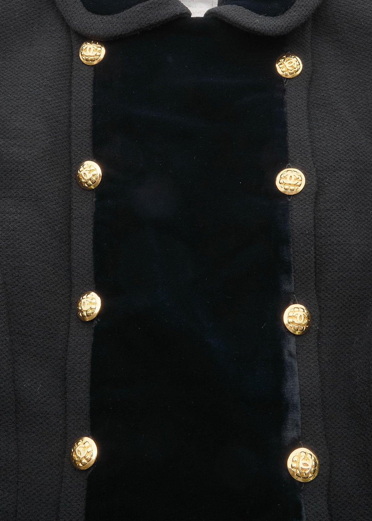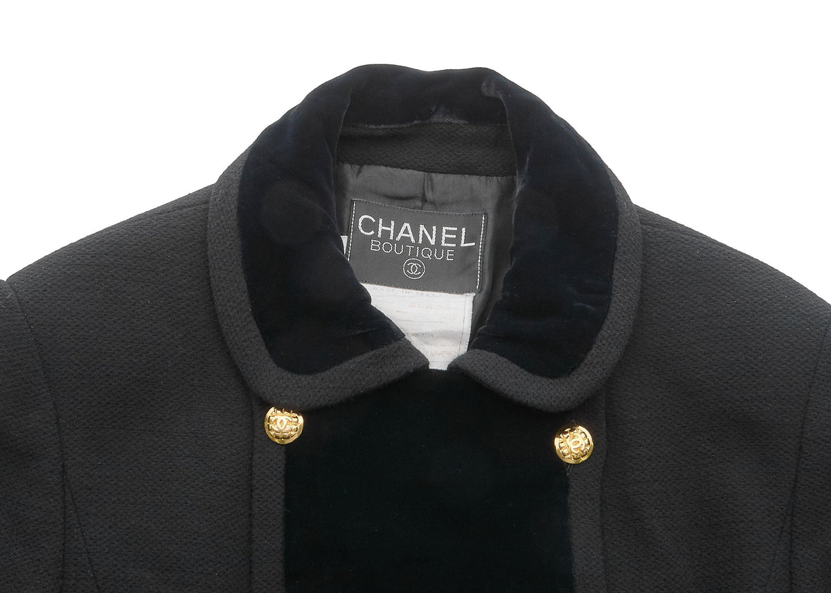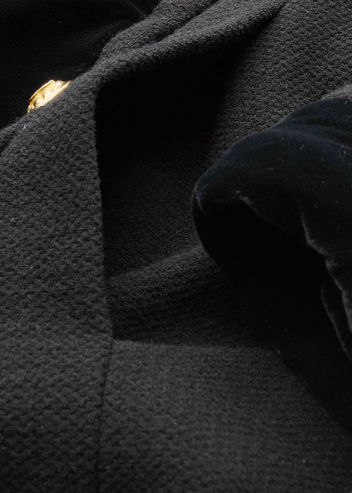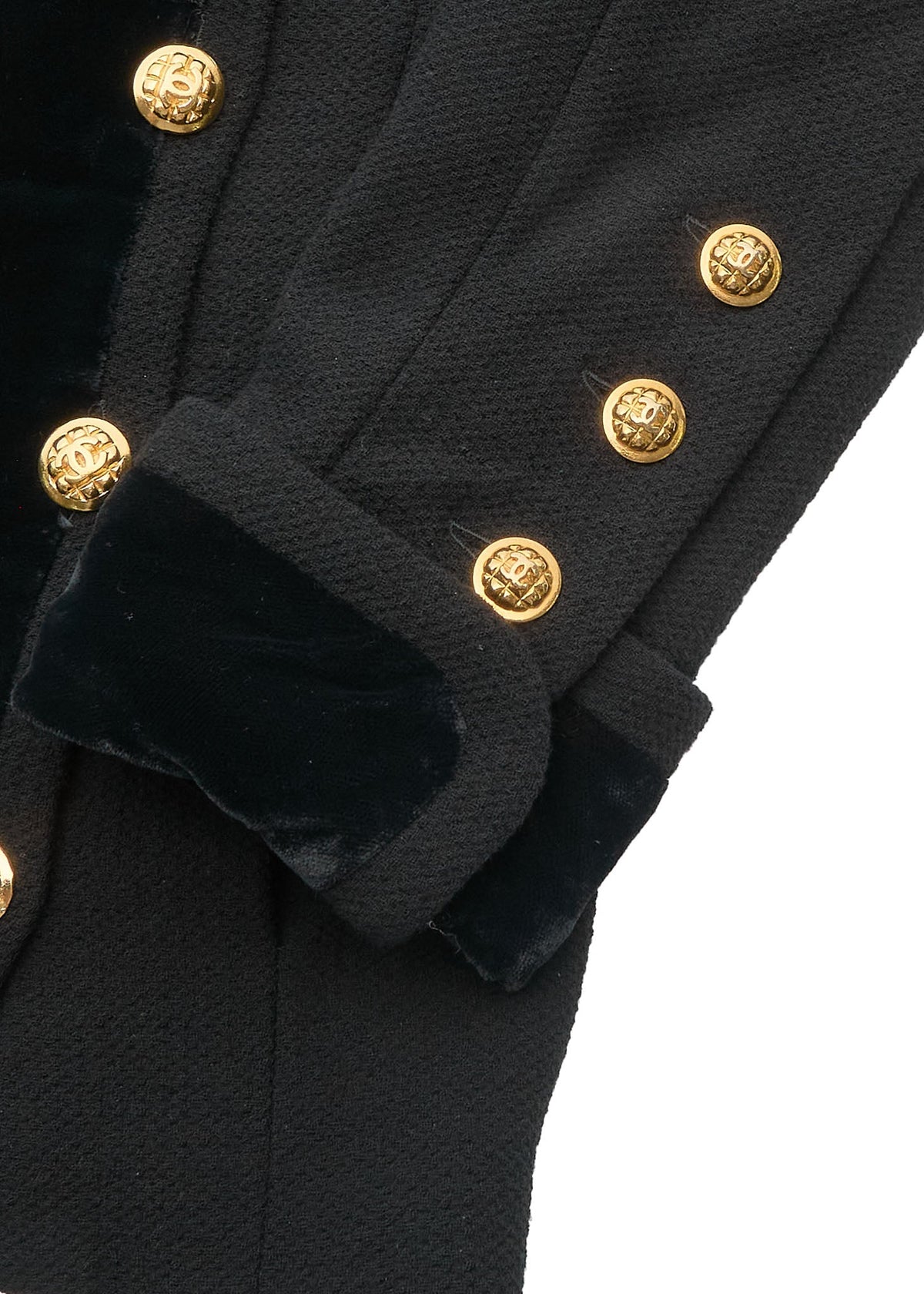 Gebrauchter Oberbekleidungsmantel, Coco-Knopf, Tweed-Samt, Schwarz, goldfarbene Hardware, gebraucht