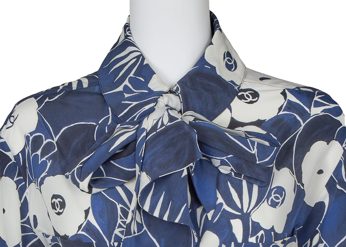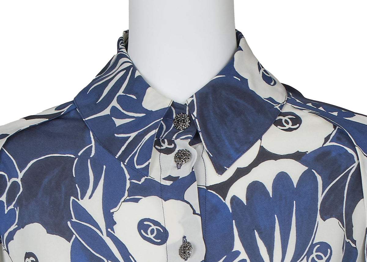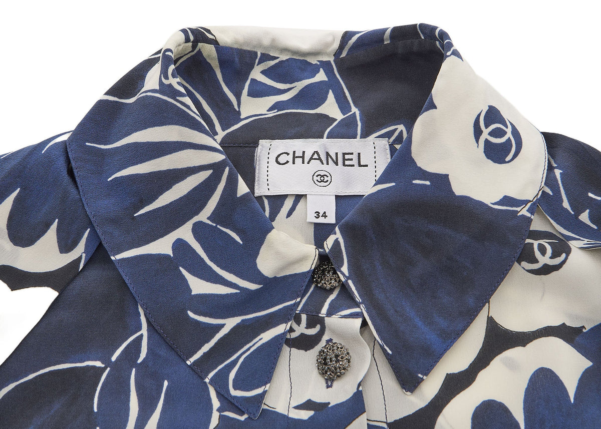 Werten Sie Ihre Garderobe mit der exquisiten CHANEL Coco Mark Camellia Coco Button Shirt Bluse in atemberaubendem Blau-Weiß auf. Diese luxuriöse, langärmelige Cut-and-Sew-Strickjacke aus 100 % Seide bietet einen raffinierten Fall und unvergleichlichen Tragekomfort.