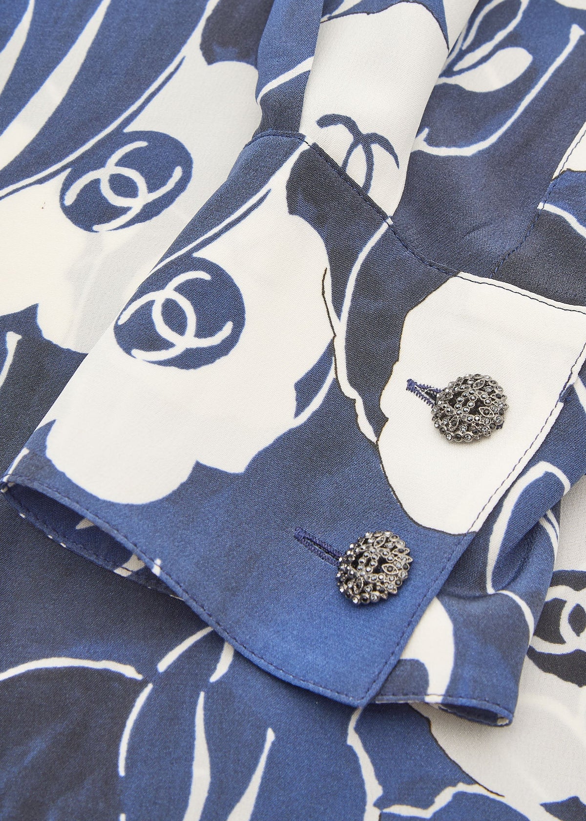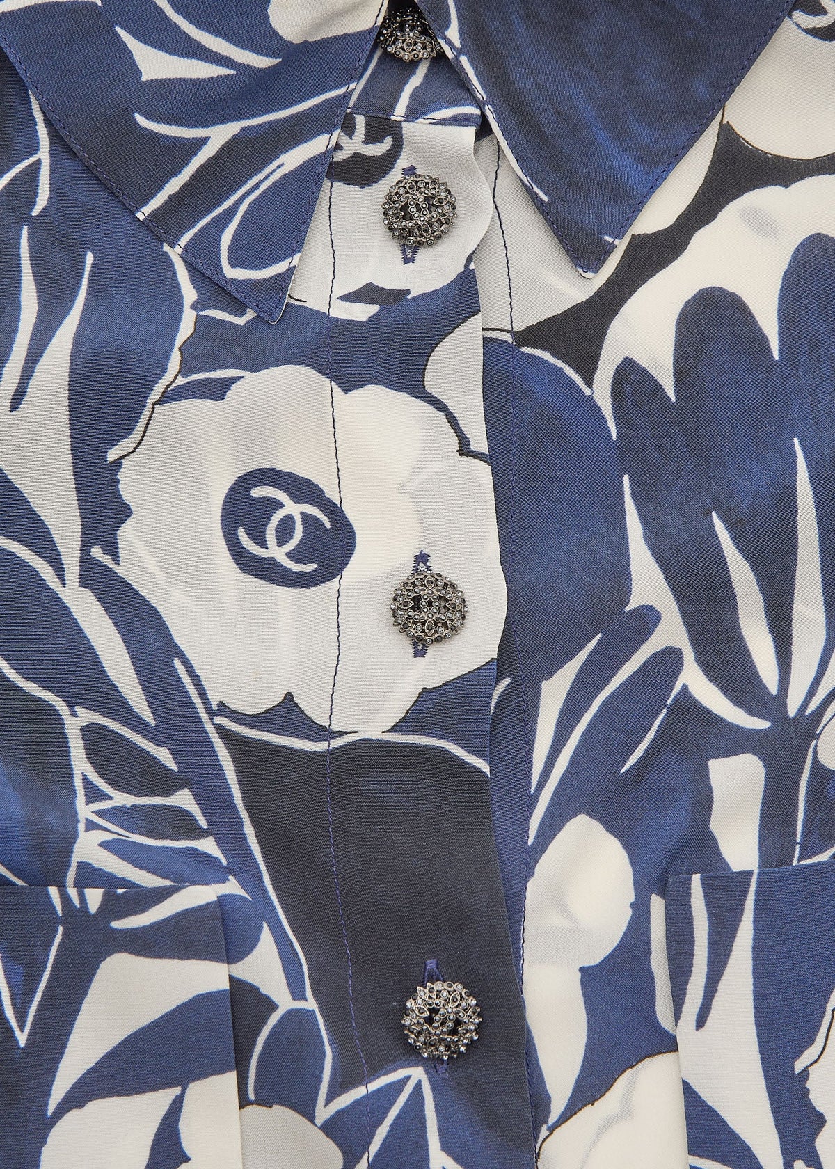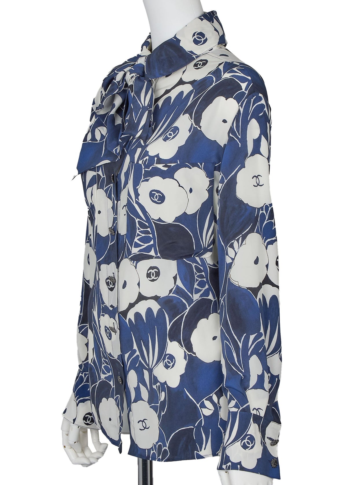 Werten Sie Ihre Garderobe mit der exquisiten CHANEL Coco Mark Camellia Coco Button Shirt Bluse in atemberaubendem Blau-Weiß auf. Diese luxuriöse, langärmelige Cut-and-Sew-Strickjacke aus 100 % Seide bietet einen raffinierten Fall und unvergleichlichen Tragekomfort.