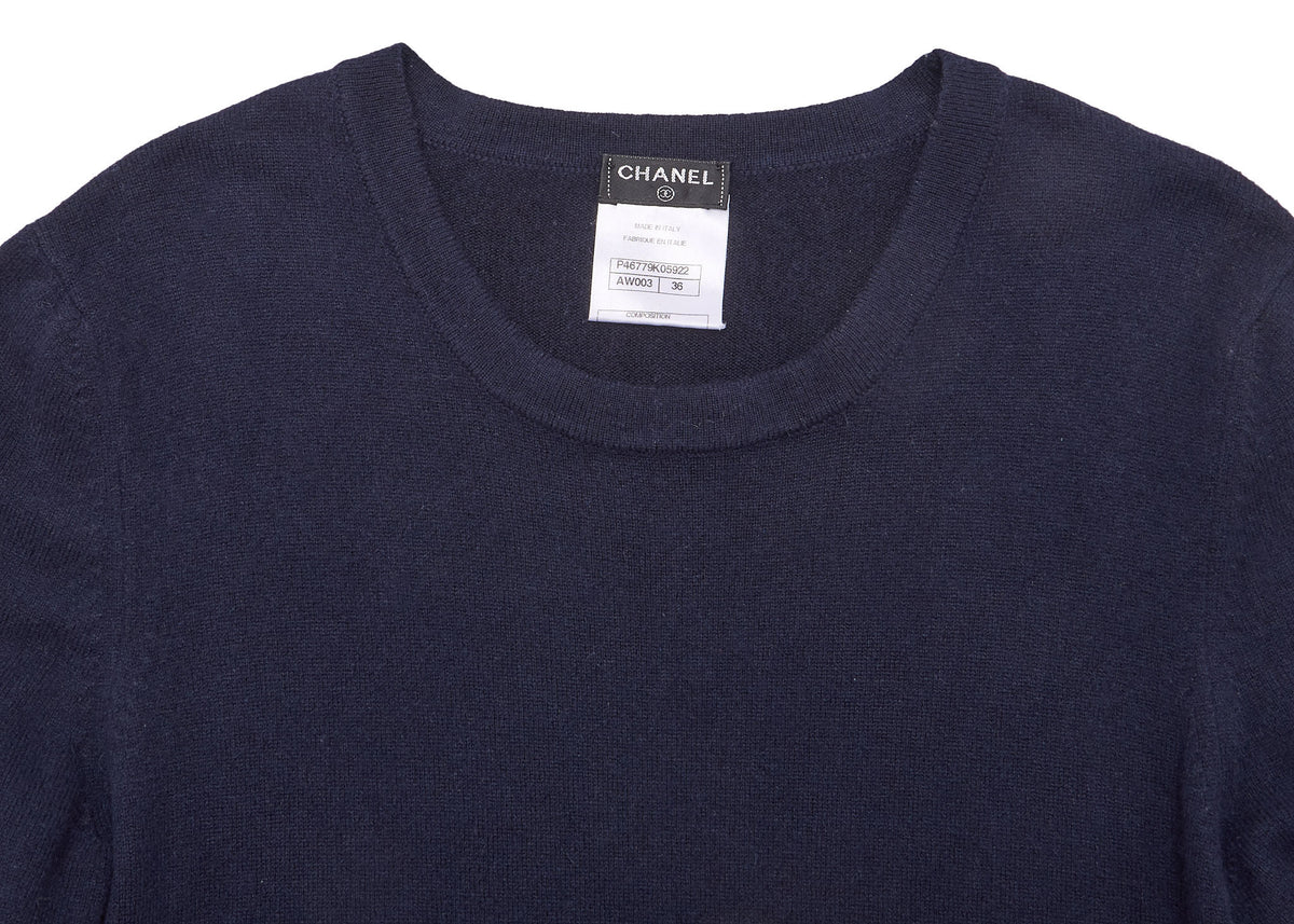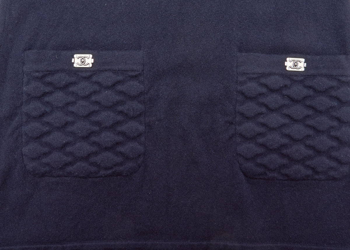 Entdecken Sie die Eleganz des CHANEL Coco Mark Kaschmirkleids 36 in klassischem Marineblau, das Ihre Garderobe mit luxuriösem Komfort und zeitlosem Stil bereichert. Dieses exquisite Stück ist nicht nur ein Kleid; es ist eine Investition in Qualität und Raffinesse.