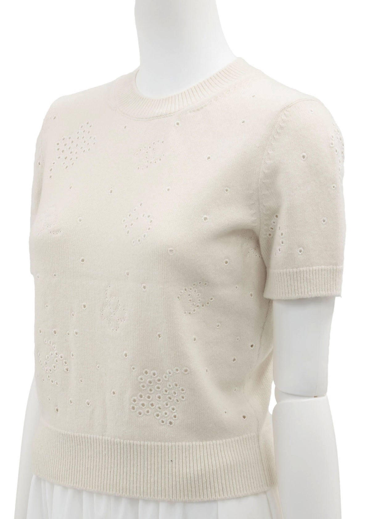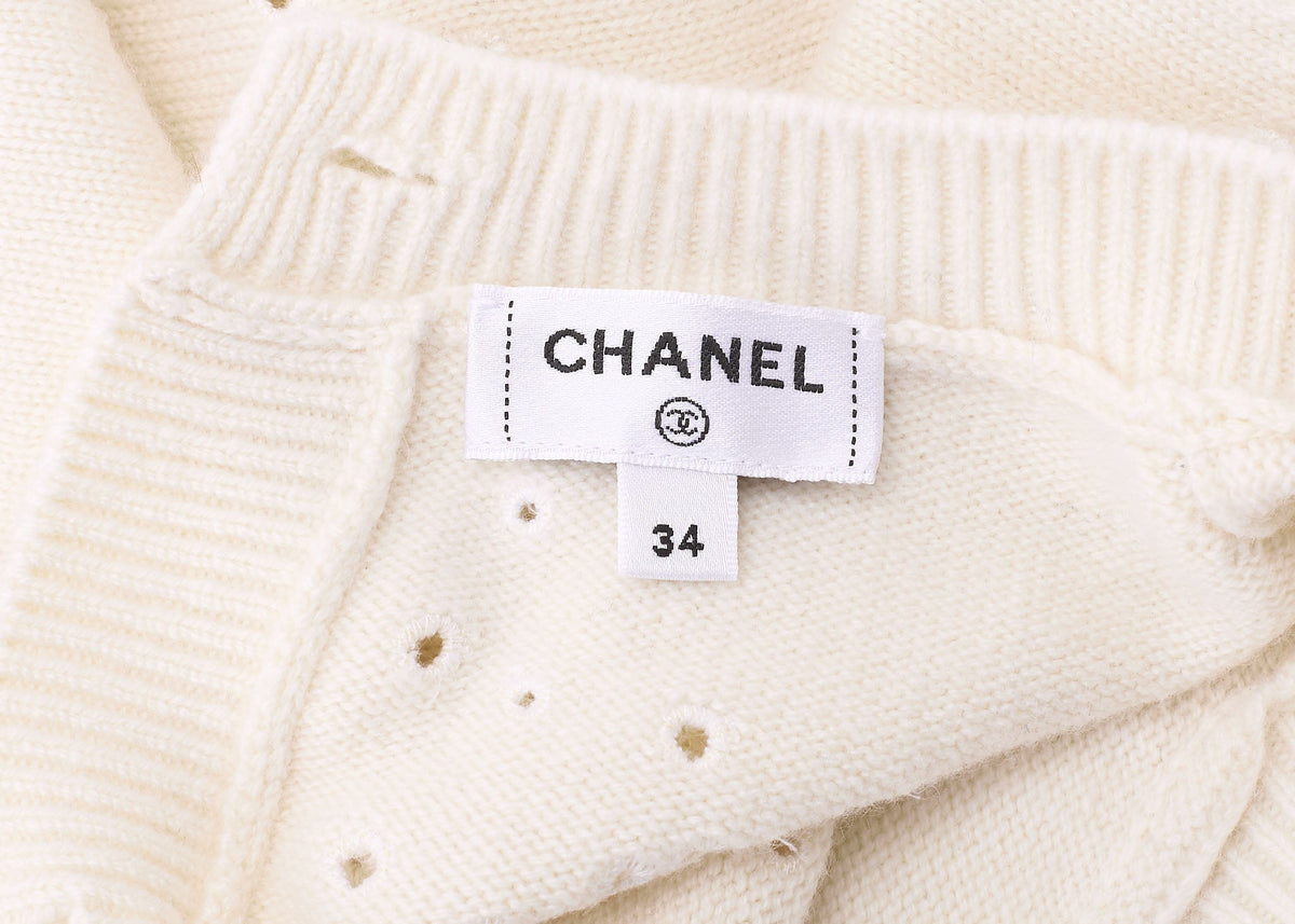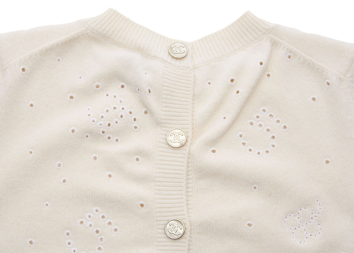 Werten Sie Ihre Garderobe mit dem exquisiten CHANEL Coco Mark Coco Button Short Sleeve Knit 34 Cashmere Ivory Tops T-Shirt auf. Dieses atemberaubende elfenbeinfarbene Top aus 100 % luxuriösem Kaschmir verkörpert die zeitlose Eleganz und höchste Qualität, für die CHANEL bekannt ist.