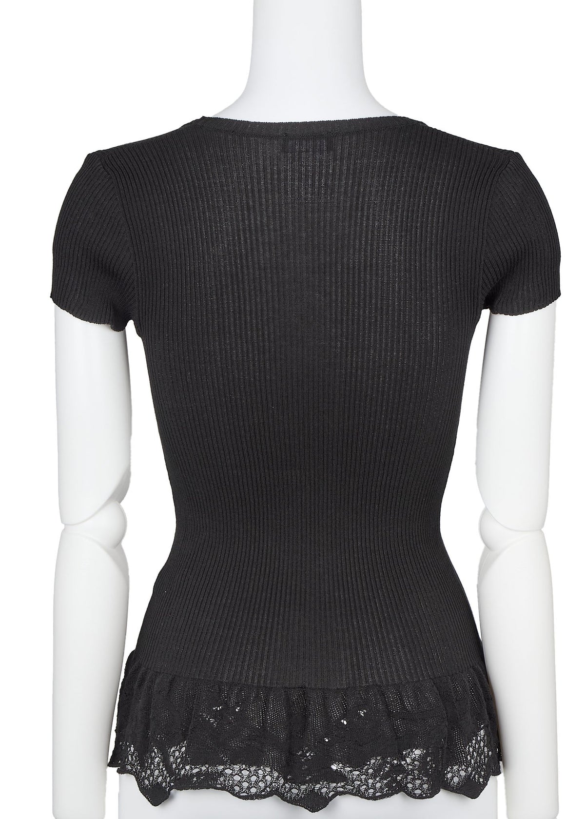 Die elegante schwarze Farbe macht es zu einer vielseitigen Ergänzung für jedes Outfit und lässt sich nahtlos vom Tag in die Nacht verwandeln. Das einzigartige Cut-and-Sew- Design besticht durch zarte Spitzenakzente, die diesem klassischen Kurzarmoberteil einen Hauch von Raffinesse verleihen.