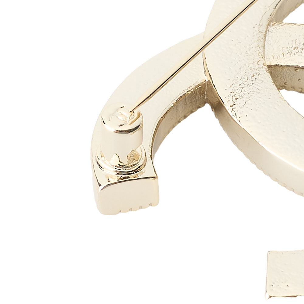 Dieses exquisite Schmuckstück aus hochwertiger Goldplattierung präsentiert nicht nur das zeitlose CHANEL -Logo, sondern besticht auch durch wunderschöne Perlenakzente, die für einen Hauch von Luxus sorgen. Mit den Maßen ca. 5 cm (B) x 3,7 cm (H ) ist es ein vielseitiges Accessoire, das jedes Outfit mühelos aufwertet.