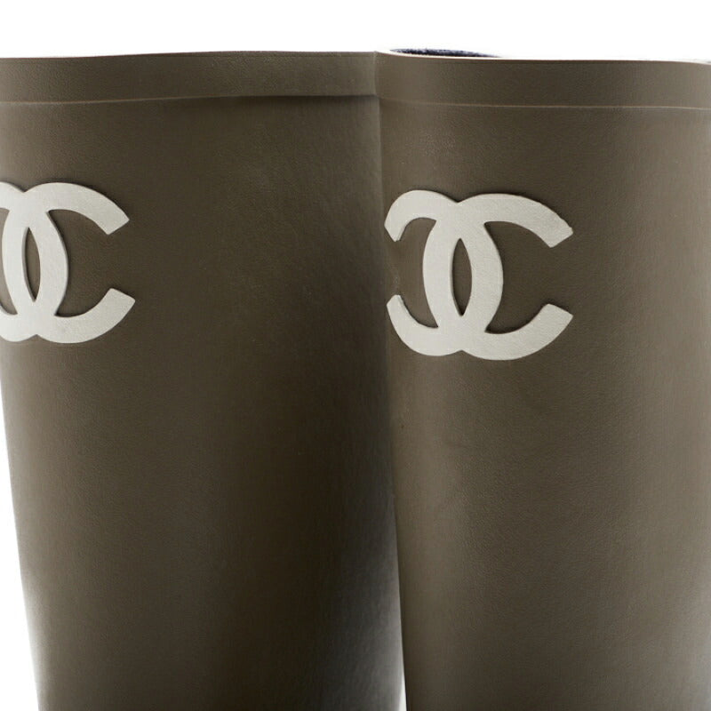 Mit den CHANEL Coco Mark Gummistiefeln sind Sie bei jedem Wetter stilvoll und bequem unterwegs. Diese Stiefel aus hochwertigem Gummi halten Ihre Füße nicht nur trocken, sondern setzen auch ein modisches Statement. Die schicke Farbgebung in Khaki und Weiß passt perfekt zu jedem Outfit und macht sie zu einer vielseitigen Ergänzung Ihrer Garderobe.