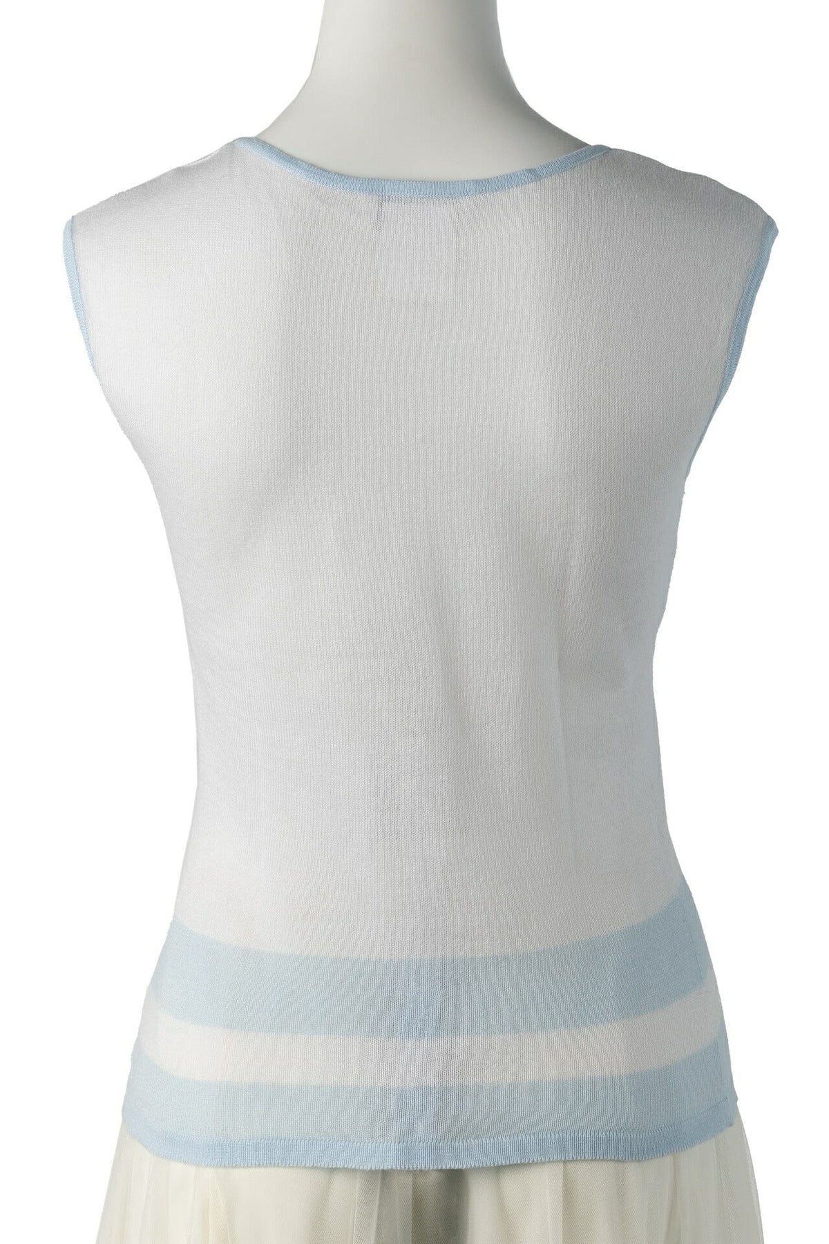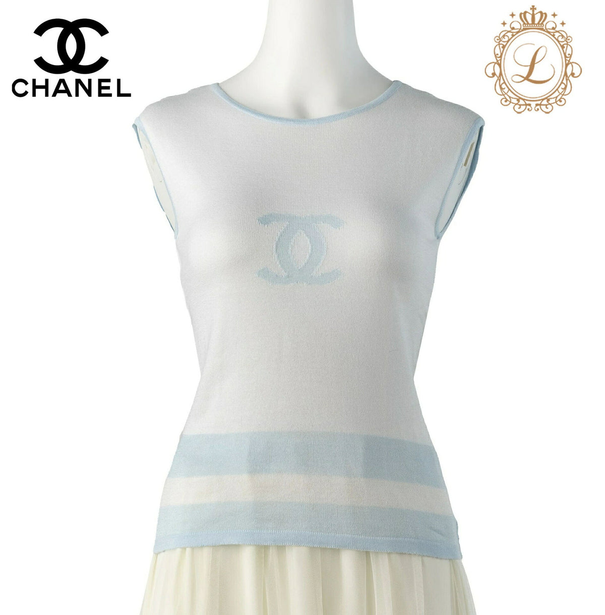 Werten Sie Ihre Garderobe mit dem exquisiten CHANEL Coco Mark ärmellosen Cut-and-Sew Tops T-Shirt 34 Weiß & Blau auf . Dieses atemberaubende Stück vereint zeitlose Eleganz mit modernem Stil und ist damit ein Must-have für Modebegeisterte.