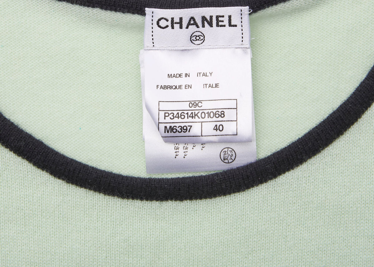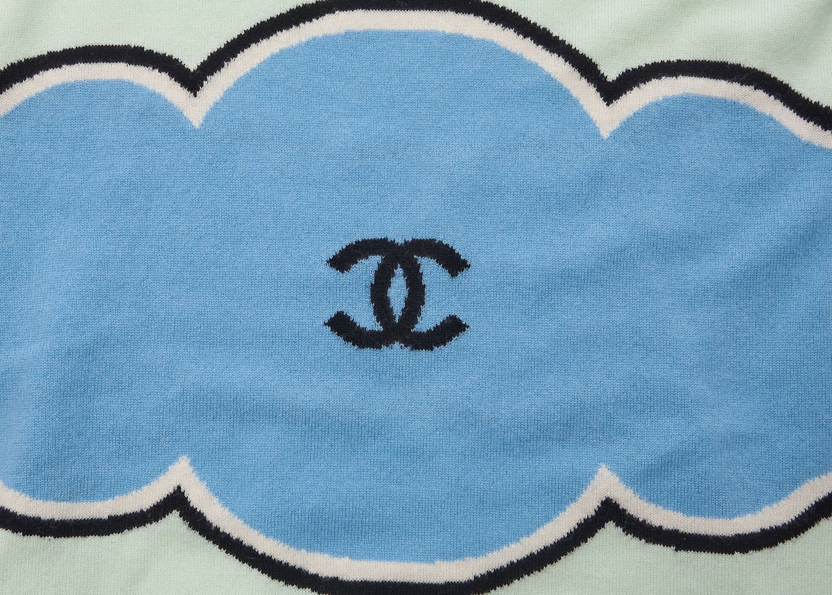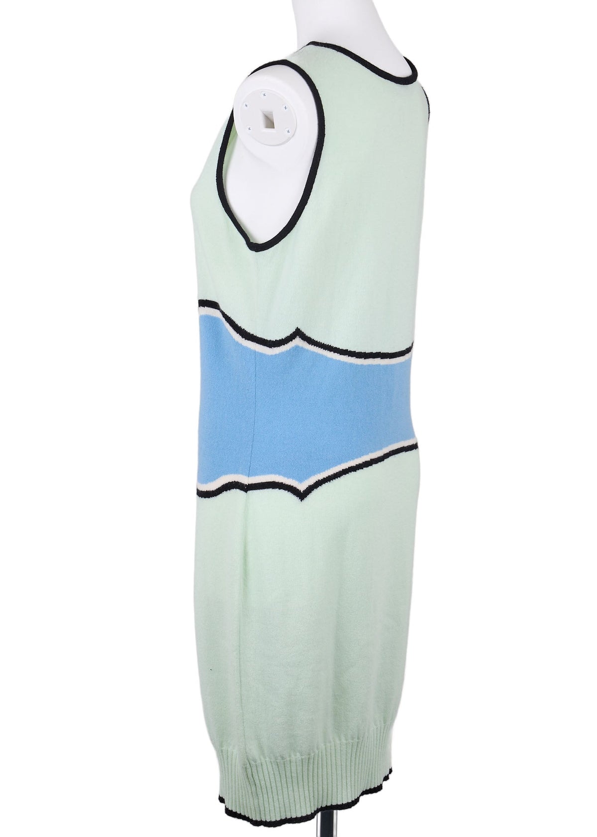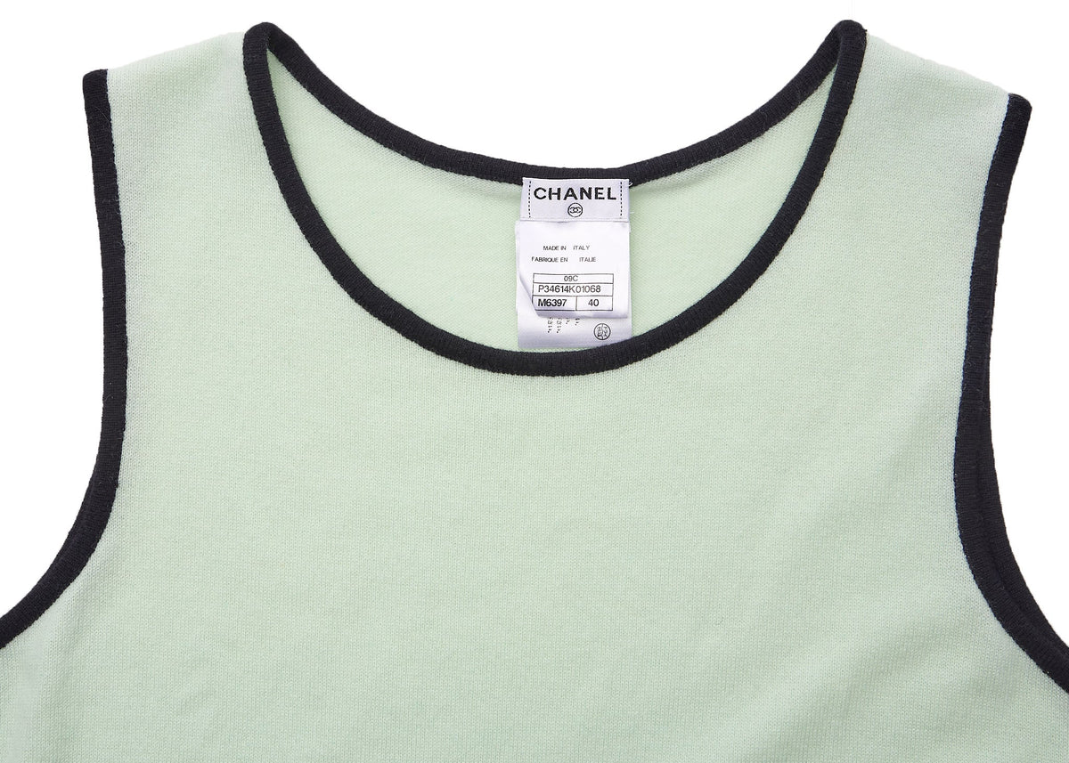 Erweitern Sie Ihre Garderobe mit dem exquisiten ärmellosen Kleid Coco Mark von CHANEL – eine atemberaubende Kombination aus Eleganz und Komfort, perfekt für jeden Anlass. Dieses luxuriöse Kleid aus 100 % Kaschmir besticht durch die einzigartige Farbkombination aus Grün und Blau und ist ein echter Hingucker.