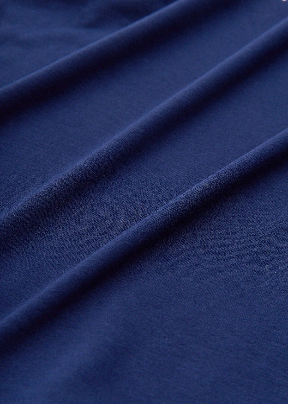 Gebrauchtes T-Shirt, kurzärmelig, Schnittmuster, Polyester, Marineblau, goldfarbene Metallteile, gebraucht