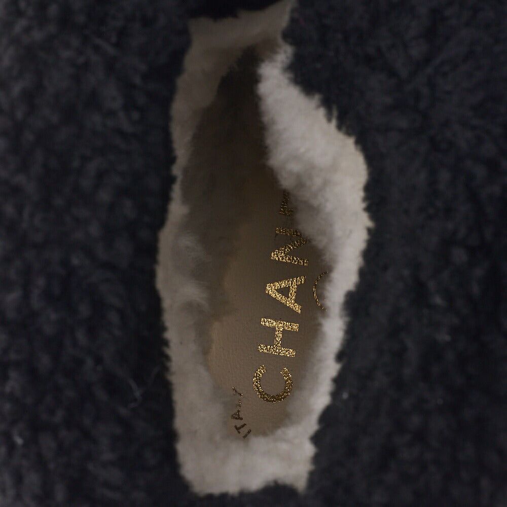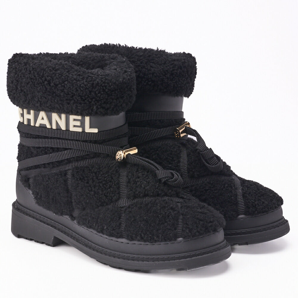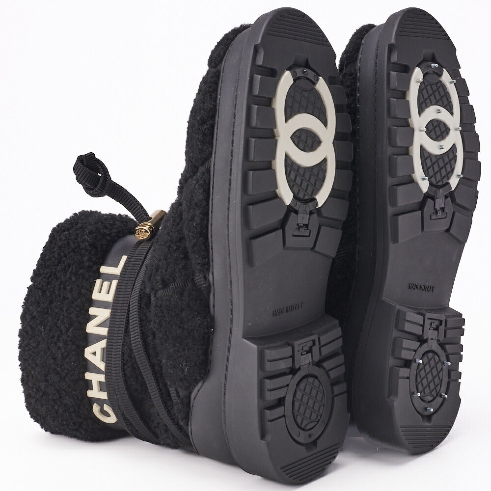 Erweitern Sie Ihre Winterschuhkollektion mit den CHANEL Logo Mouton Schneestiefeln in schickem Schwarz. Die fachmännisch aus hochwertigem Boa-Material gefertigten Stiefel strahlen nicht nur Luxus aus, sondern sorgen auch dafür, dass Ihre Füße in den kalten Monaten warm und stilvoll bleiben.