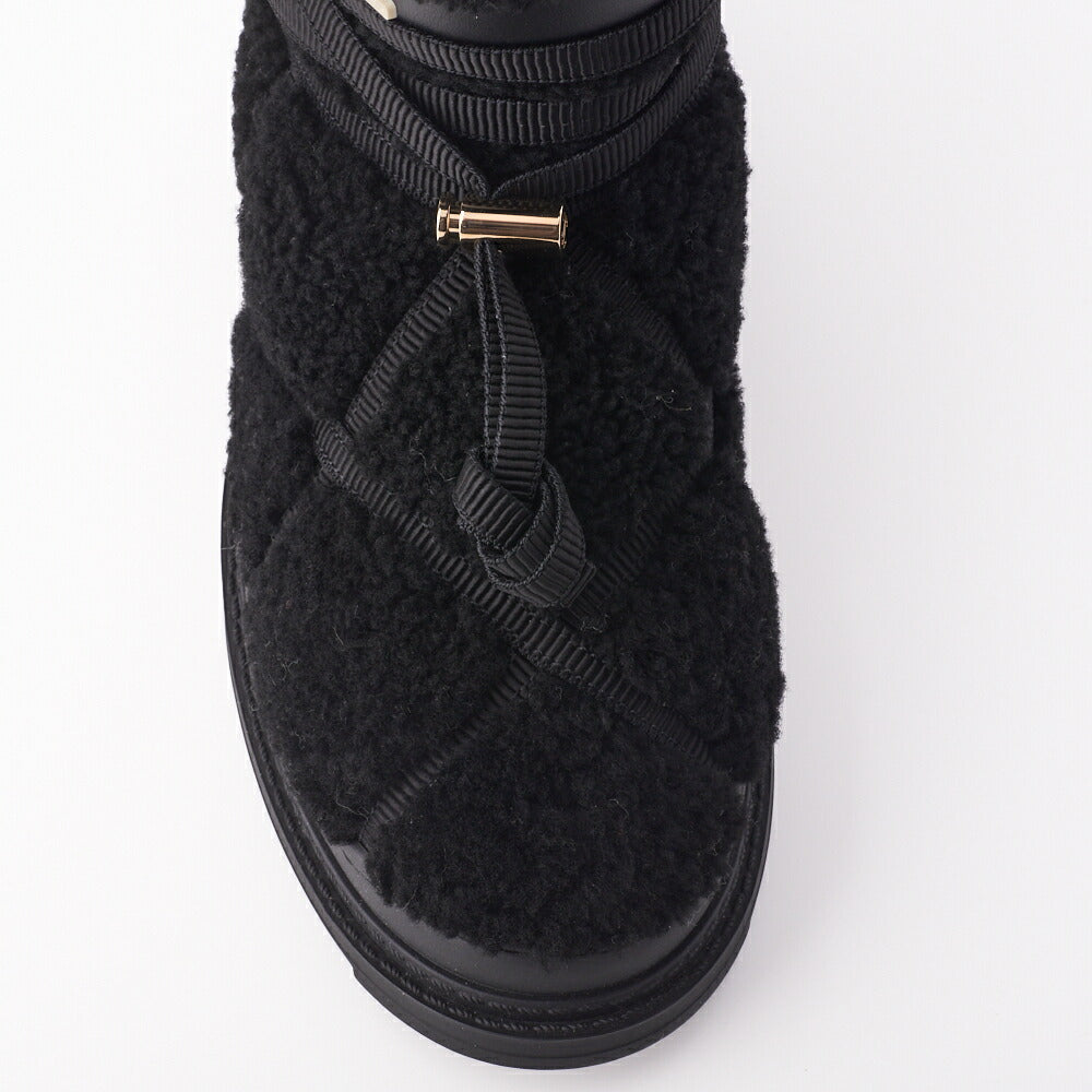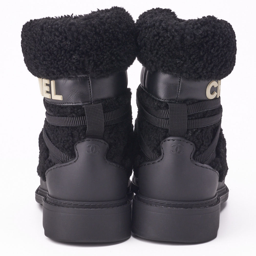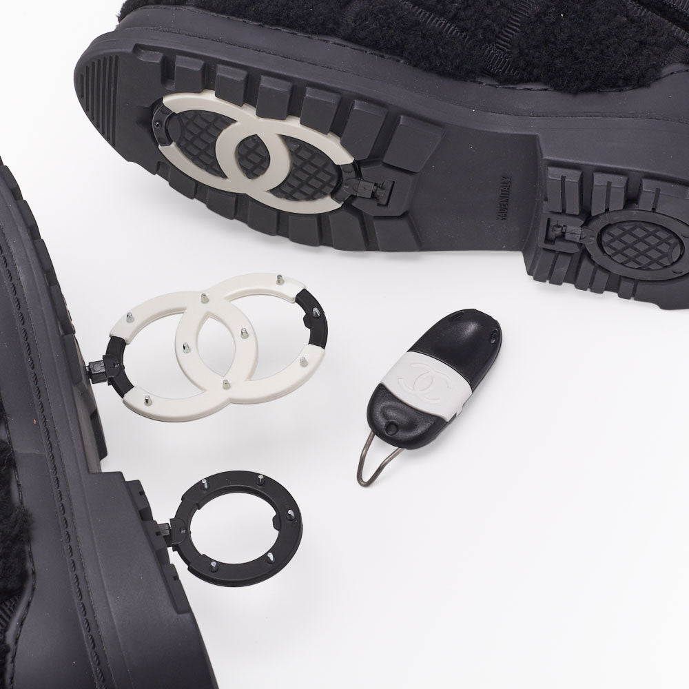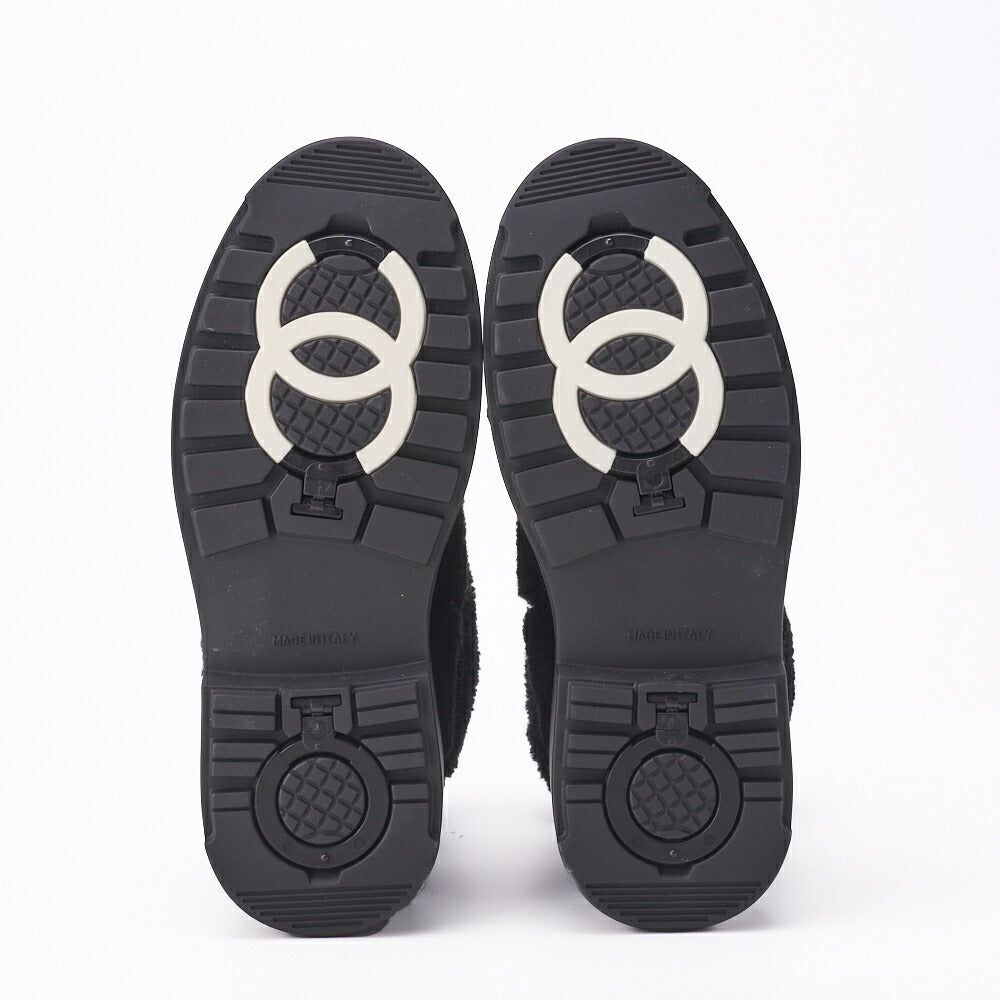 Erweitern Sie Ihre Winterschuhkollektion mit den CHANEL Logo Mouton Schneestiefeln in schickem Schwarz. Die fachmännisch aus hochwertigem Boa-Material gefertigten Stiefel strahlen nicht nur Luxus aus, sondern sorgen auch dafür, dass Ihre Füße in den kalten Monaten warm und stilvoll bleiben.