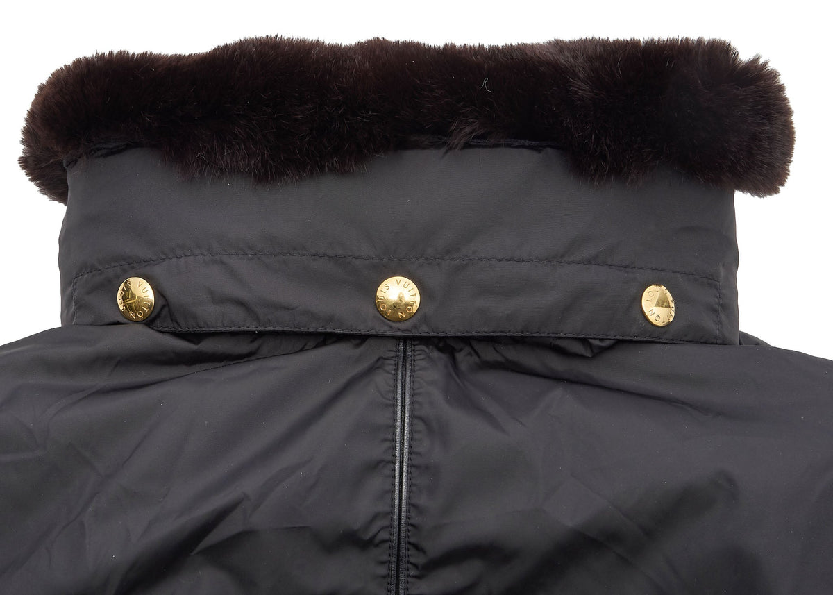 Gönnen Sie sich Luxus mit der LOUIS VUITTON Louis Vuitton Monogram Daunenjacke 34. Dieses exquisite schwarze Oberbekleidungsstück ist für alle gedacht, die Stil und Funktionalität gleichermaßen schätzen. Gefertigt aus 100 % hochwertiger Wolle wärmt diese Daunenjacke nicht nur, sondern strahlt auch Eleganz aus.