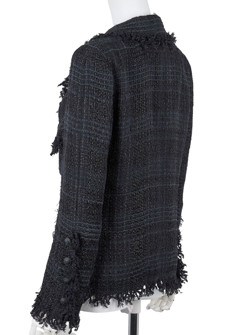 Gebrauchte Jacke, Coco-Knopf, Langarm, Schnittmuster, Stoff, Schwarzgrün, goldfarbene Metallteile, gebraucht