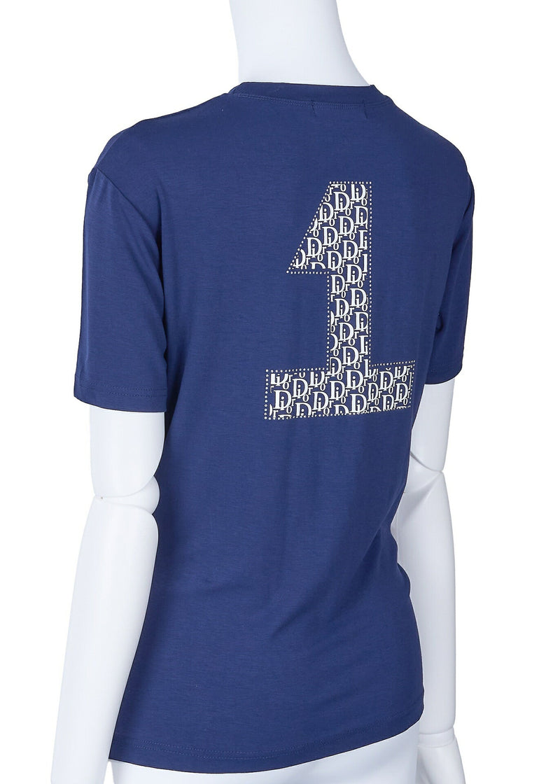 Gebrauchtes T-Shirt, kurzärmelig, Schnittmuster, Polyester, Marineblau, goldfarbene Metallteile, gebraucht