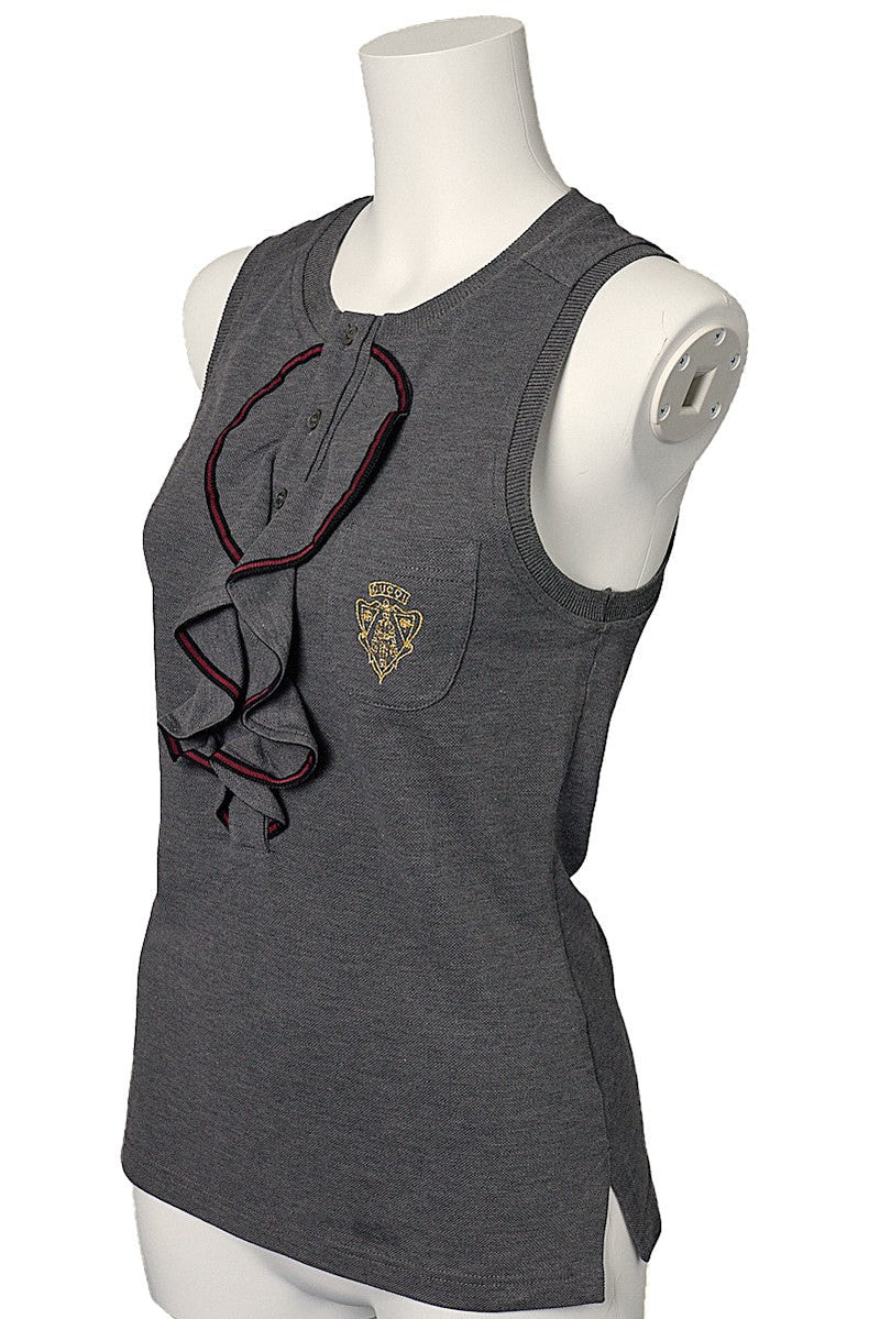 Gebrauchtes T-Shirt, Rüschen, Cut-and-Sew, Baumwolle, Grau, Silberfarbene Metallteile, Gebraucht