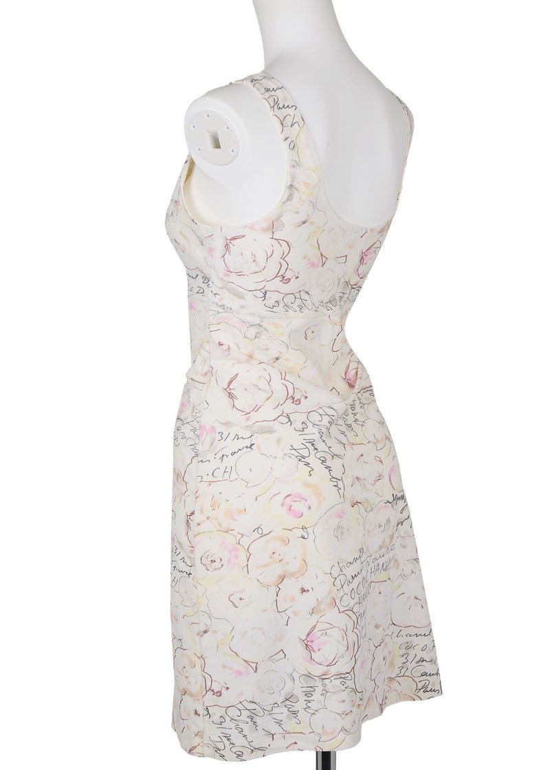 Ärmelloses Kleid aus zweiter Hand, Kamelien-Logo, Nylonmischung, Elfenbein, silberfarbene Metallteile, gebraucht