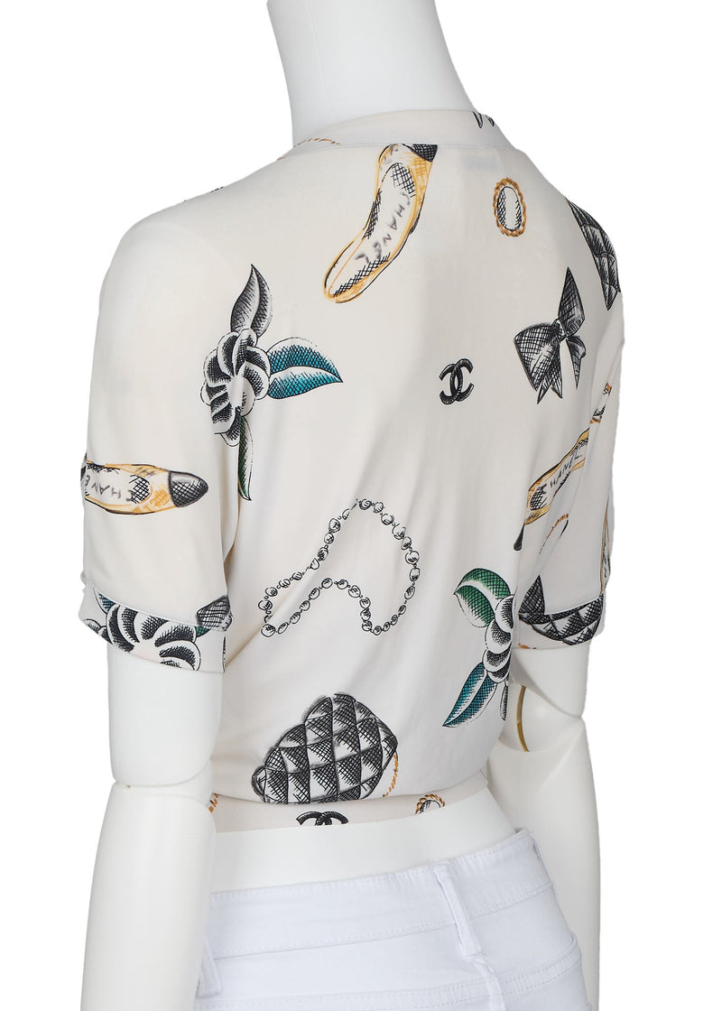 Gebrauchtes T-Shirt, Cropped, Total Pattern, Nylon-Spandex-Mischung, Weiß, Goldfarbene Hardware, Gebraucht