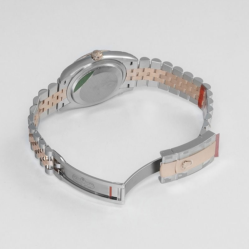 Die Rolex Datejust 126231-0013 besteht aus Edelstahl und Everose-Gold. Sie verfügt über ein kratzfestes Glas und eine Saphirglasabdeckung. Sie hat einen Durchmesser von 36 mm und ein Schweizer Präzisionswerk Kaliber 3235. Der Spitzname „Dark Rhodium“ stammt von der einzigartigen Kombination aus Grau und Roségold mit Sonnenschliff. Das Zifferblatt ist dunkelgrau und mit Indexen versehen. Das Armband ist ein Jubilee-Armband aus ineinandergreifenden Edelstahl- und Everose-Gold-Gliedern. Gekrönt wird es von der Rolex-Krone der Perfektion.