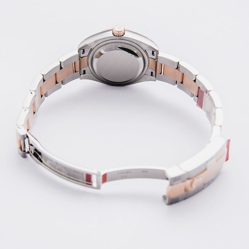 Die Rolex Lady-Datejust ist mit einem Oyster-Gehäuse ausgestattet, das durch Verschrauben von Lünette, Gehäuseboden und Twinlock-Krone mit dem Monobloc-Mittelteil hermetisch abgedichtet ist. Dank dieser Versiegelung ist das Gehäuse bis zu einer Tiefe von 100 Metern/330 Fuß wasserdicht. Die Rolex Uhr 279171-0016G verfügt außerdem über einen gravierten Rehaut, ein kratzfestes Saphirglas mit Zykloplupe und ein Perpetuum Mobile Kaliber 2235 mit Quickset-Funktion. Als mittelgroße Referenz ist das Gehäuse etwas größer als bei herkömmlichen Rolex Datejust-Uhren und wird an einem fünfgliedrigen Rolex-Armband mit verdeckter Crownclasp-Schließe getragen.