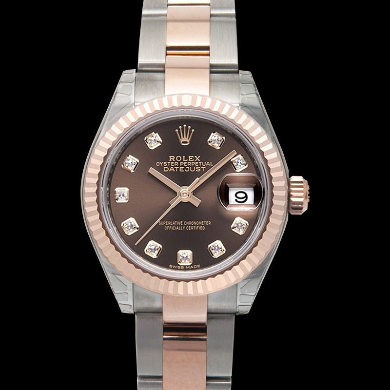 Lady Datejust 28 mm, schokoladenbraun, mit Diamanten besetzt, Zifferblatt aus Edelstahl, Everose-Gold 279171-0012