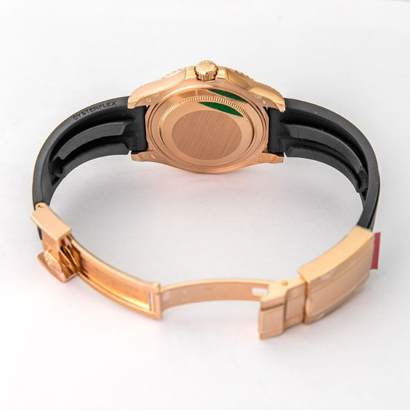 Die drehbare Roségoldlünette dieser Rolex Yacht-Master mit schwarzem Keramikeinsatz und ansprechender 60-Minuten-Kalibrierung ist das markanteste Merkmal. Unter dem kratzfesten Saphirglas präsentiert sich die Rolex Yacht-Master 268655 mit einem ebenholzschwarzen Zifferblatt mit Chromalight-Mercedes-Zeigern und Roségold-Indizes. Um der Referenz 268655 ein feminines Aussehen zu verleihen, hat Rolex sie mit einem Roségoldgehäuse mit 37 mm Durchmesser ausgestattet, das vor allem von Damen bevorzugt wird. Die Uhr ist dennoch unisex und läuft mit dem hauseigenen Perpetuum Mobile Kaliber 2236 mit 55 Stunden Gangreserve. Sie bietet zudem mehrere Zeitfunktionen, eine Countdown-Funktion und sogar ein Datum bei 3 Uhr. Für ihren sportlichen Look verfügt die Rolex Yacht-Master 268655 über ein schwarzes Oysterflex-Kautschukarmband mit faltbarer Roségold-Oysterlock-Schließe. Für Komfort und Sicherheit beim Tauchen.