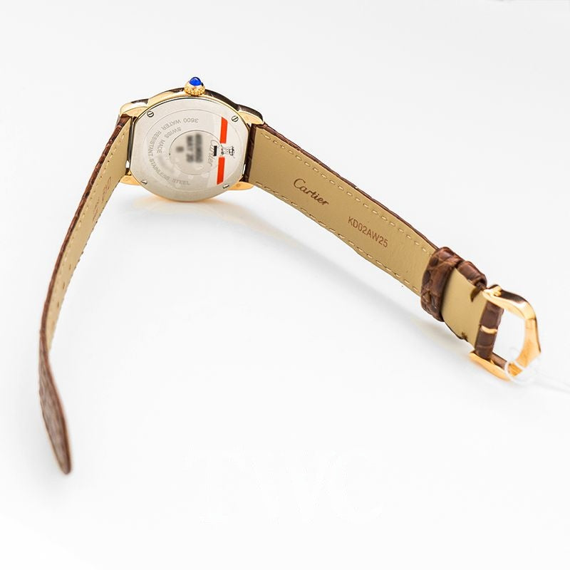 Die kleine und edle Cartier Ronde de Cartier W6701007 besitzt ein 29,55 mm großes Gehäuse aus Stahl und Roségold. Die perlmuttbesetzte Aufzugskrone aus Roségold mit einem Spinell-Cabochon verleiht der Uhr zusätzliche Pracht. Das versilberte Opalin-Zifferblatt der Cartier Ronde de Cartier W6701007 besticht durch eine klassische 24-Stunden-Anzeige mit römischen und arabischen Ziffern. Neben den gebläuten Stahlzeigern bietet die Ronde de Cartier dank ihres Quarzwerks höchste Präzision. Das braune Alligatorlederarmband mit abgerundeten Schuppen und einer Dornschließe aus Roségold verleiht ihr zusätzliche Eleganz und Exklusivität. Dank ihres Saphirglases ist die Cartier Ronde de Cartier W6701007 bis zu 30 Meter wasserdicht und eignet sich daher auch hervorragend zum Schwimmen und Schnorcheln am Strand.
