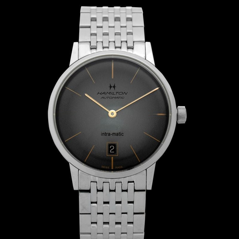 Die Herrenlinie der Hamilton American Classic Kollektion umfasst einige der stilvollsten und elegantesten Uhren auf dem Markt. Das Modell Hamilton American Classic H38455181 hat ein rundes 38-mm-Edelstahlgehäuse mit Edelstahlarmband. Das Zifferblatt hat einen schwarzen Außenrand, der in der Mitte ins Graue übergeht. Die roségoldenen Indizes und Zeiger bilden einen Kontrast zu den dunkleren Tönen des Zifferblatts, während das Datumsfenster bei 6 Uhr die Uhr vervollständigt. Das Herzstück der Uhr bildet das zuverlässige Kaliber 2892-A2, das einem Wasserdruck von bis zu 5 bar standhält.