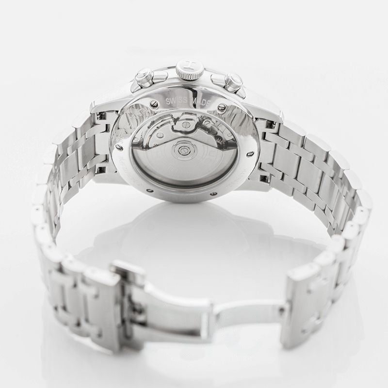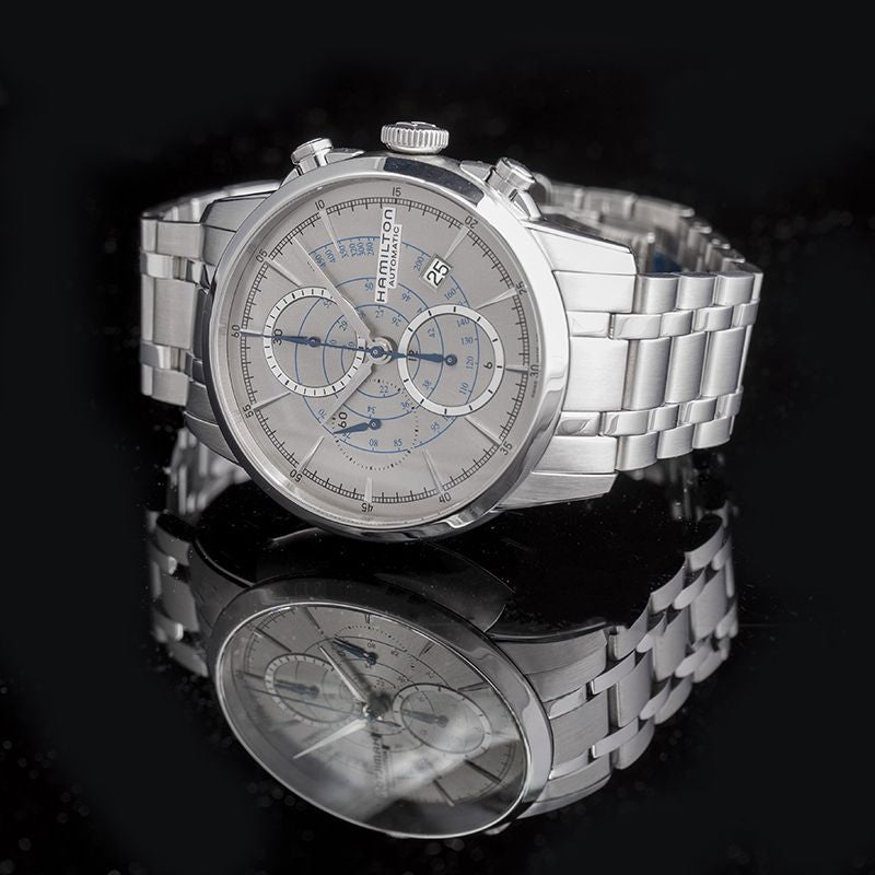 Die Railroad Auto Chrono versetzt Sie zurück in die Zeit, als sich die Marke als Präzisionsuhrmacher einen Namen machte und Uhren herstellte, die zur Verbesserung der Sicherheit auf der Eisenbahn beitrugen. Das automatische Chronographenwerk verleiht der Uhr eine dynamische Note, und der azurierte Tachymeter befriedigt das Tempobedürfnis ihres Trägers. Diese American Classic Railroad Auto Chrono, Modell H40656181, gehört zur Kategorie der Dresswatches und eignet sich daher perfekt für legere und formelle Anlässe. Das Gehäuse ist 44 mm groß und aus Edelstahl gefertigt. Es verfügt über ein silberfarbenes Zifferblatt mit silberfarbenen Zeigern und Indexen, Tachymetermarkierungen und Minutenmarkierungen am äußeren Rand. Das Uhrwerk wird von einem Automatikwerk angetrieben und bietet eine Gangreserve von 60 Stunden.