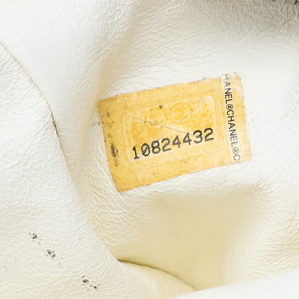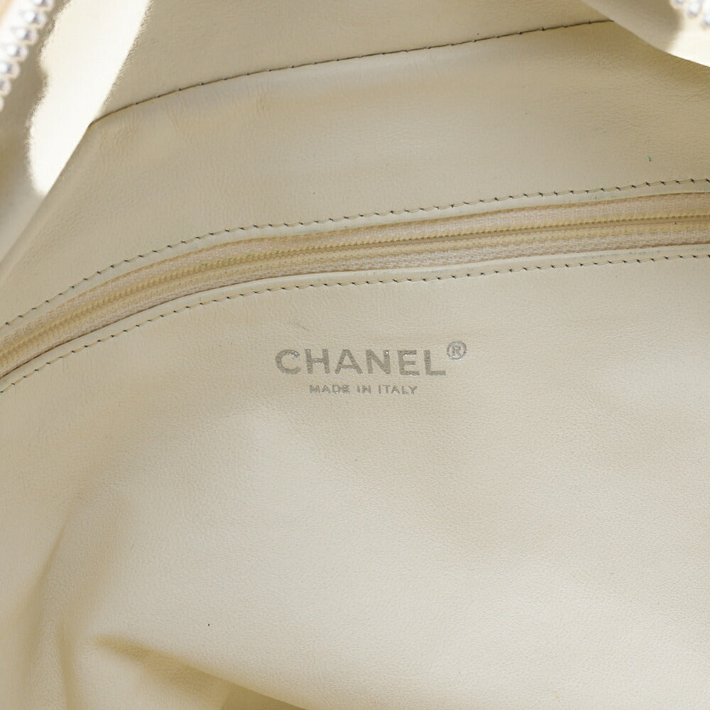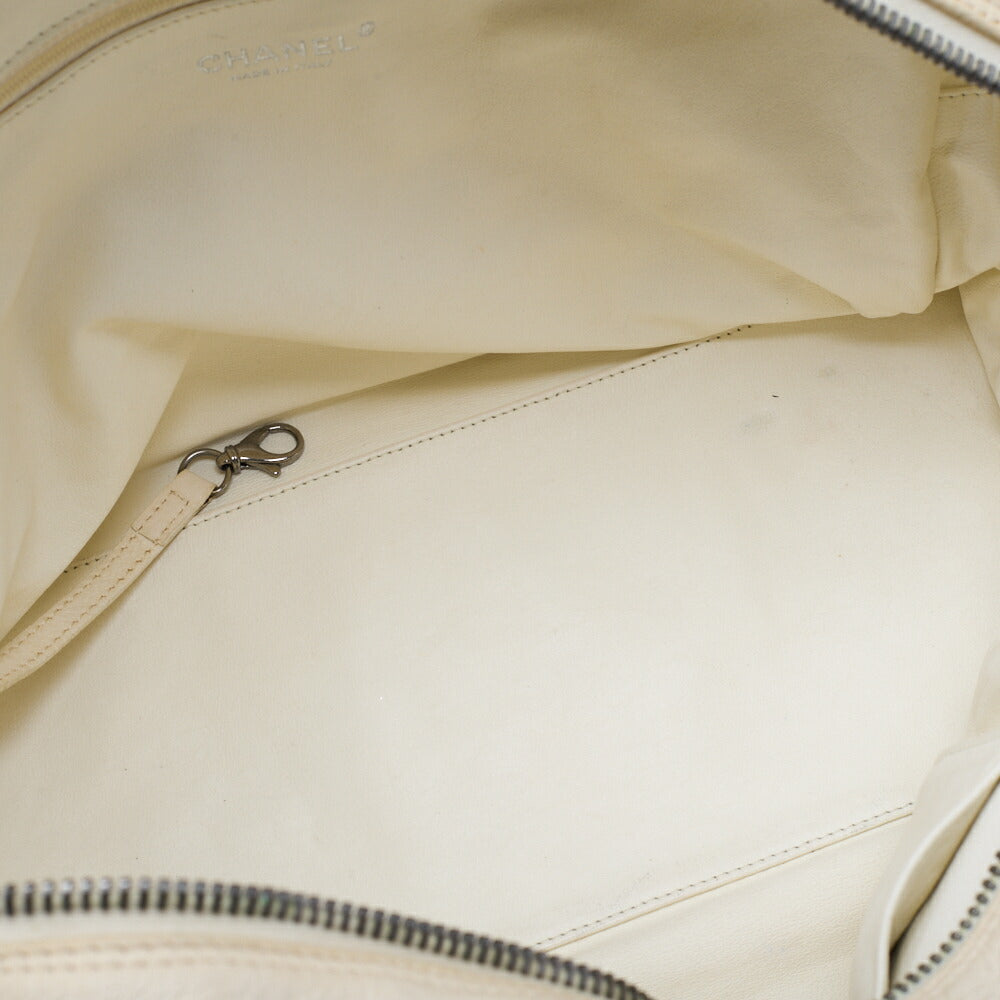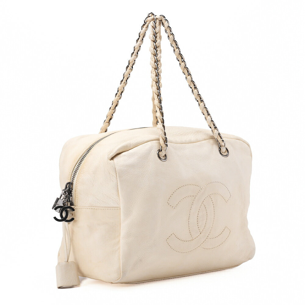 Wir präsentieren die CHANEL Coco Mark Boston Bag aus luxuriösem Leder, ein atemberaubendes Stück in makellosem Weiß mit eleganten silbernen Metallbeschlägen. Diese Tragetasche verkörpert Raffinesse und zeitlosen Stil und ist damit das perfekte Accessoire für die moderne Frau.