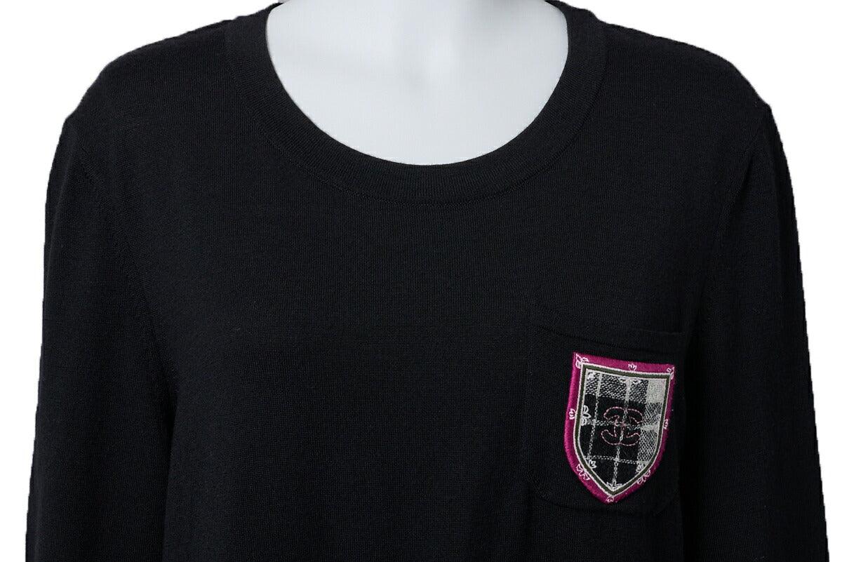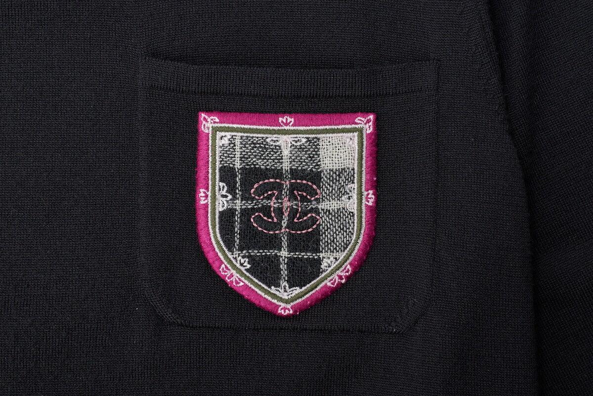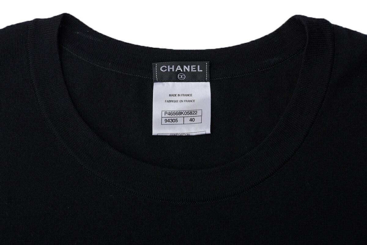 Werten Sie Ihre Garderobe mit dem CHANEL Coco Mark Emblem Kurzarm-Strickoberteil mit Rock (Größe 40) in Schwarz auf – ein atemberaubendes Kleidungsstück , das Eleganz und Komfort perfekt vereint. Gefertigt aus 100 % hochwertiger Wolle bietet dieses einteilige Design ein luxuriöses Tragegefühl auf der Haut und sorgt gleichzeitig für Wärme und Haltbarkeit.