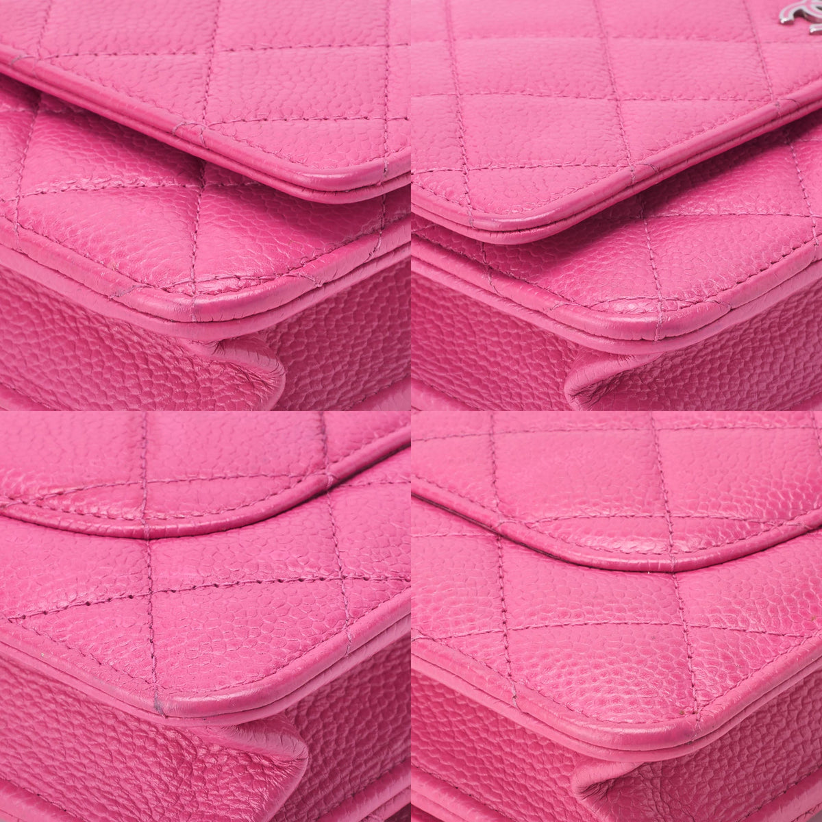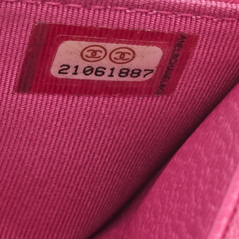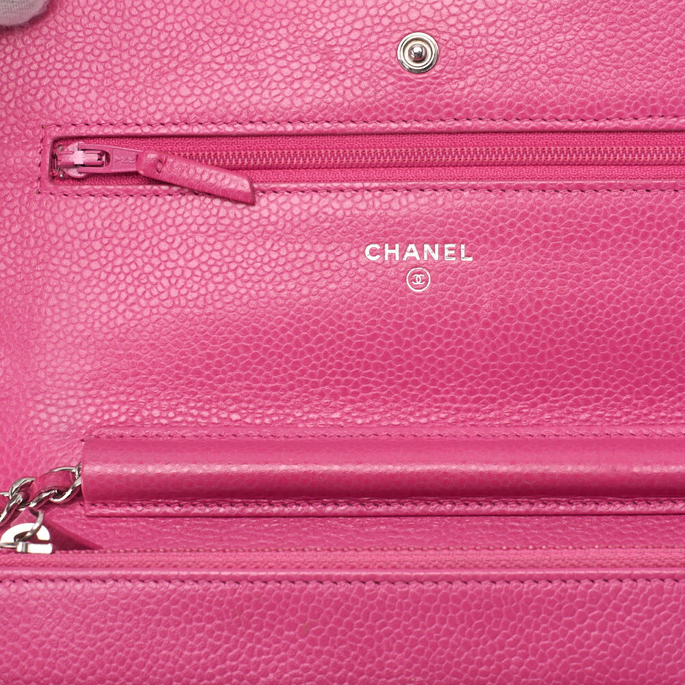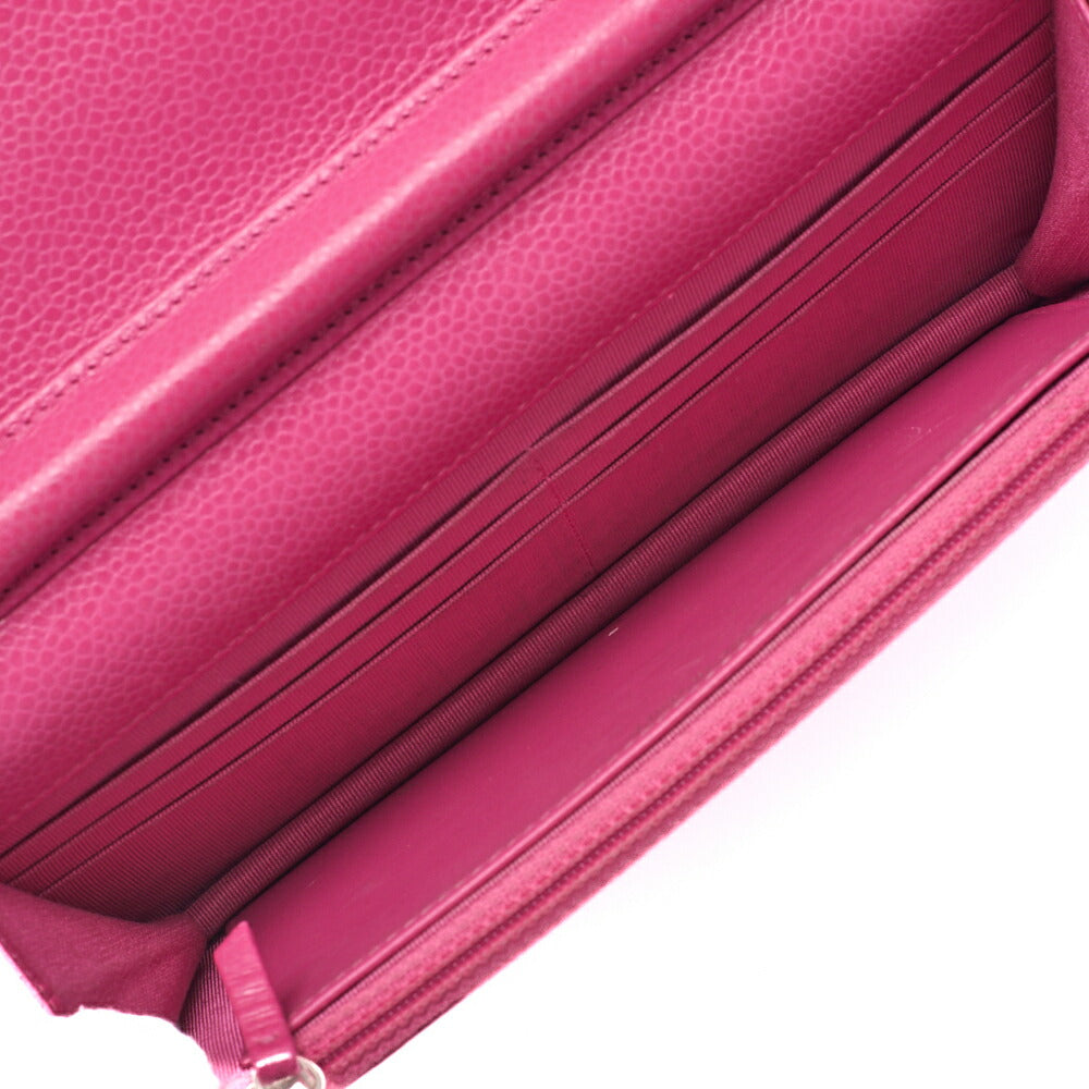 Erweitern Sie Ihre Accessoire-Auswahl mit der CHANEL Matelassé Chain Wallet in Caviar Skin Pink , wunderschön verziert mit silbernen Beschlägen. Diese exquisite Damen-Faltbrieftasche ist nicht nur ein modisches Statement; sie verkörpert Luxus, Raffinesse und Funktionalität und ist damit eine unverzichtbare Ergänzung Ihrer Sammlung.