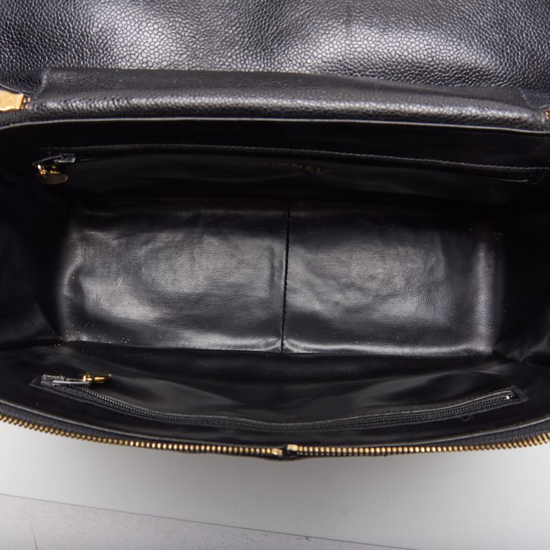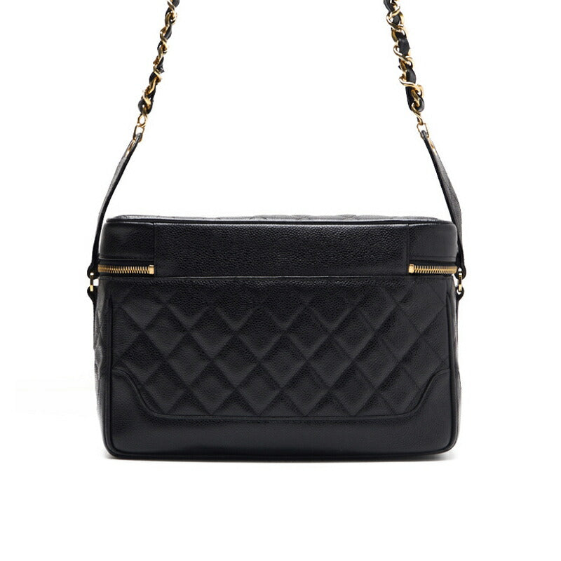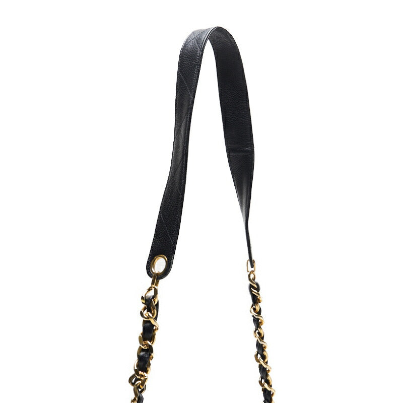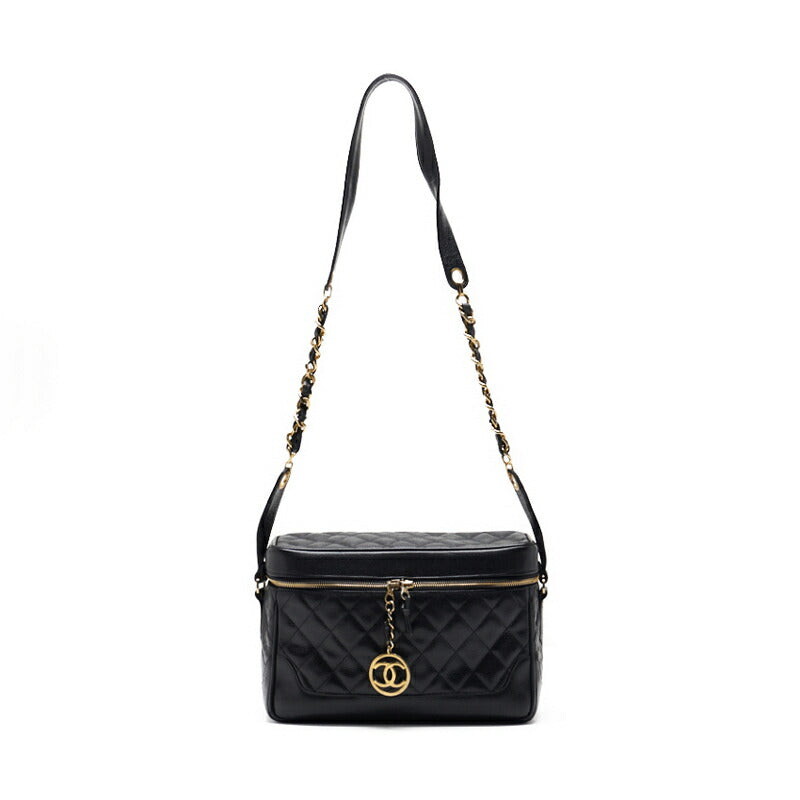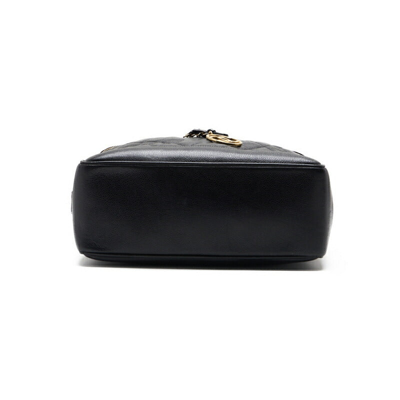 Gebrauchte Umhängetasche, Matelassé, Kreisförmiger Coco-Anhänger, Kaviarhaut, Schwarz, Goldfarbene Metallteile, Gebraucht