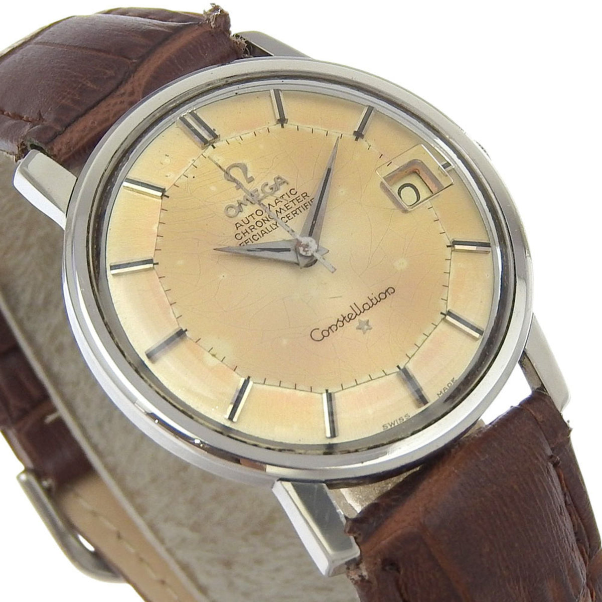 Gebrauchte OMEGA Constellation Herrenuhr 168.005 Edelstahl mit geprägtem Lederarmband, Automatik, Analoganzeige, beiges Zifferblatt, B-Rang