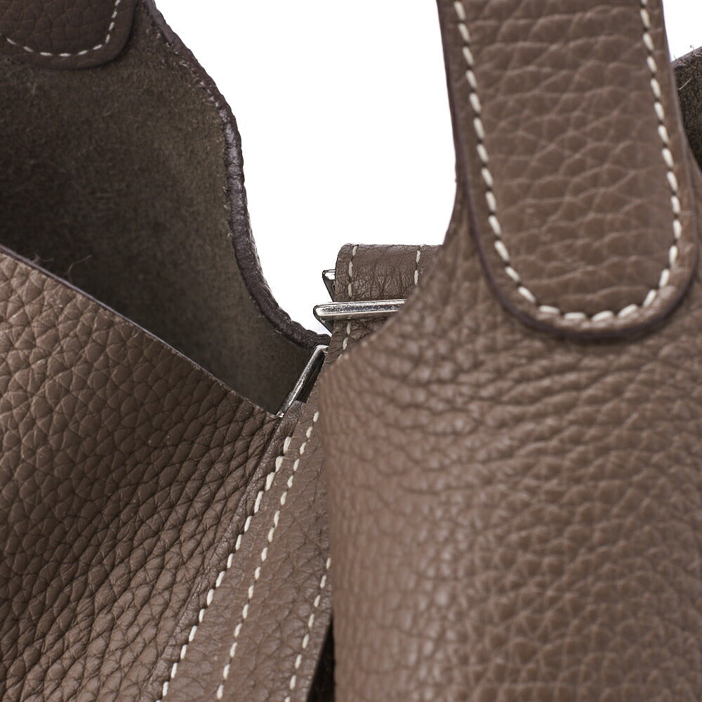 Wir präsentieren die HERMES Hermes Picotin Rock MM Handtasche aus luxuriösem Tryon Clemence Leder, elegant gestaltet in klassischem Etoupe- Farbton mit atemberaubenden silbernen Beschlägen. Diese Handtasche verkörpert die Essenz von Haute Couture und ist perfekt für die anspruchsvolle Frau, die Qualität und Raffinesse schätzt.