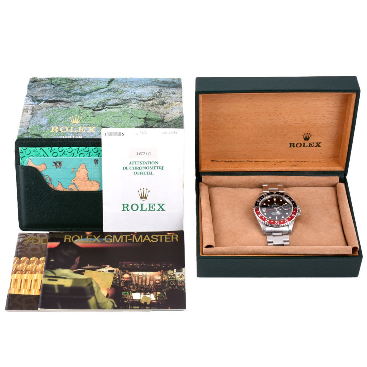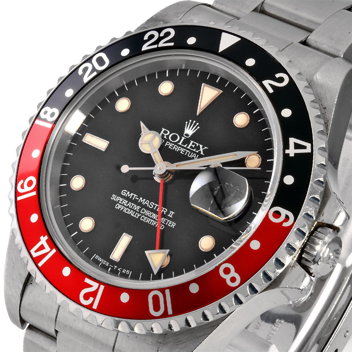 Gebrauchte Rolex ROLEX 16710 GMT Master II T-Serie (Baujahr 1996) Automatikuhr, schwarzes Zifferblatt, schwarz, rot, Kork, alles Tritium, Herren